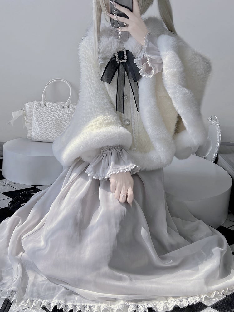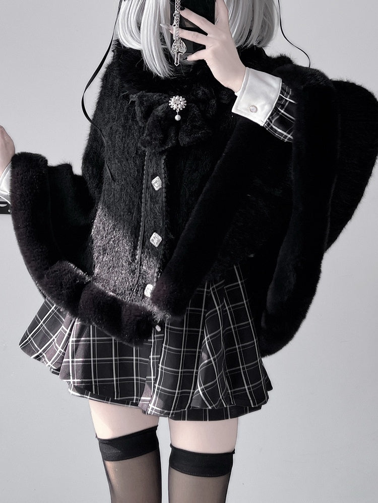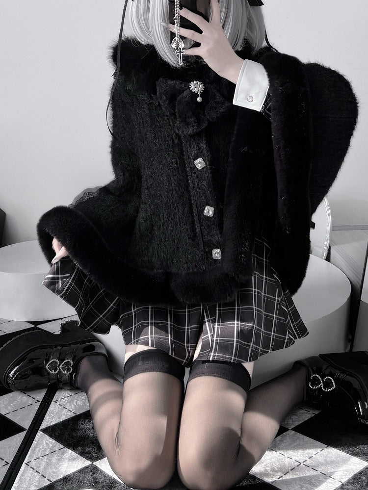 Elevate your Jirai Kei wardrobe with this exquisite Landmine Style Knit Cape, designed to captivate and charm. Crafted with meticulous attention to detail, this cape features a plush trimming hemline that adds a touch of whimsy and luxury to your ensemble. The front button placket is adorned with dazzling rhinestones, providing a sparkling accent that complements the overall aesthetic. Perfectly paired with your favorite Jirai Kei skirt, this cape is a versatile addition that effortlessly blends comfort and style. Embrace the enchanting allure of Jirai Kei fashion with this statement piece that promises to turn heads and steal hearts.
