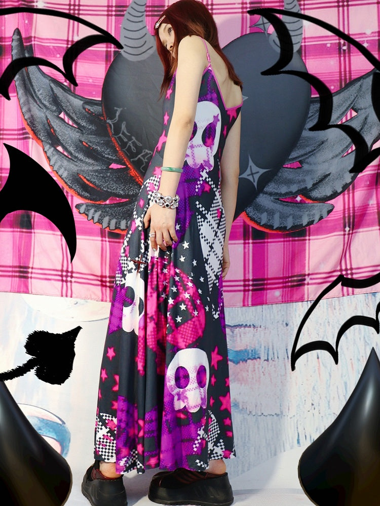 This stunning black Kuro Kawaii suspender dress perfectly blends edgy elements with a touch of cuteness. The striking skeleton and star prints add a bold statement, while the plaid heart patterns bring in a playful charm, making it a unique piece for those who love to stand out in style.