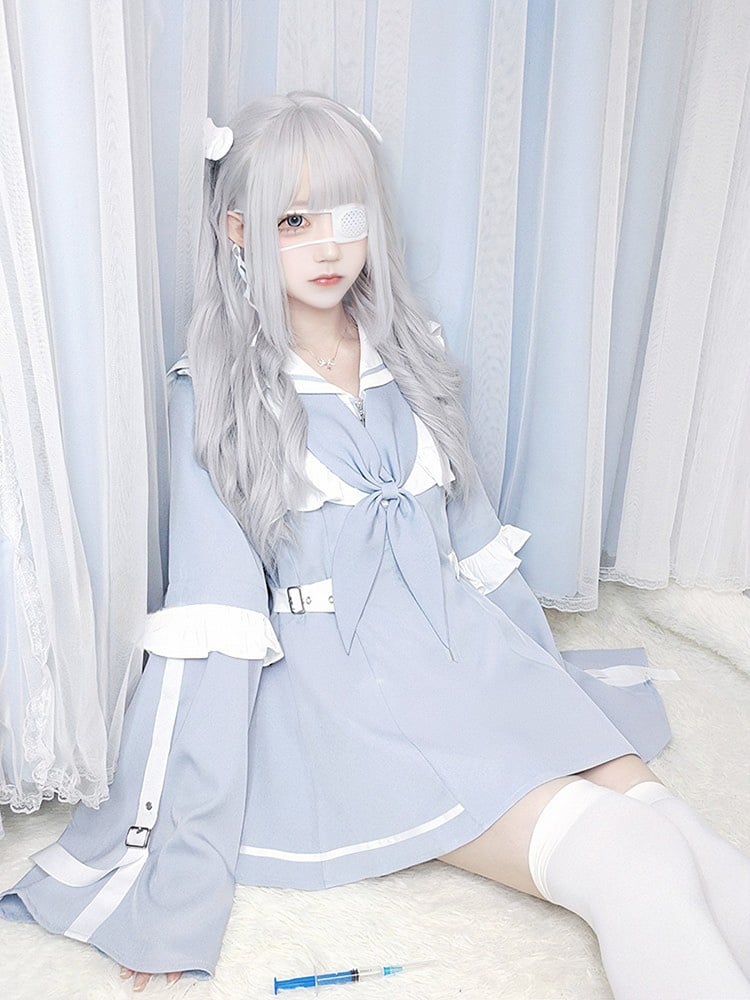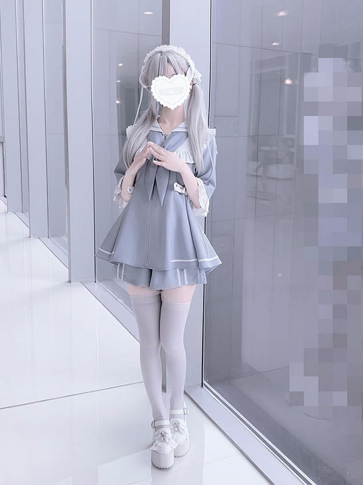Introducing our Sailor Collar Dress, featuring a classic sailor collar with ruffle trim and accordion pleats at the chest. The convenient zipper closure ensures easy on and off, while the removable half sleeves are adorned with ruffle trim for added charm. The adjustable buckle straps at the waist allow for a customizable fit. Perfect for adding a touch of kawaii charm to your wardrobe.