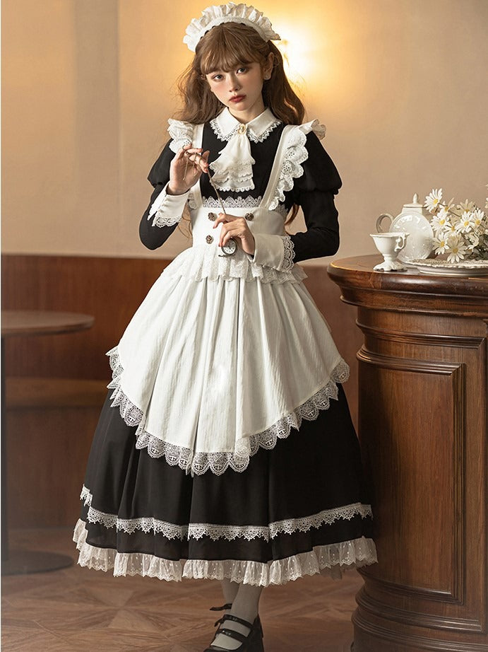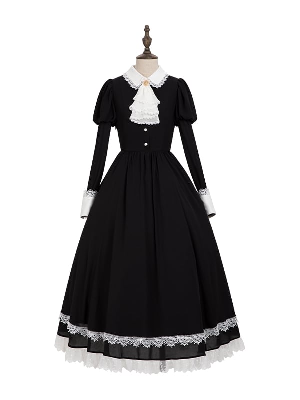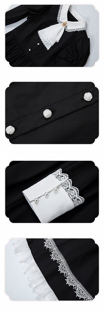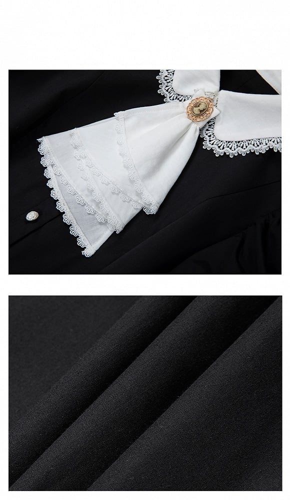 This stunning piece features a classic black dress base that exudes vintage charm, while the cinched waist and voluminous skirt create a captivating silhouette reminiscent of traditional uniforms. Delicate lace trims adorn the cuffs, collar, and hem, the bodice is beautifully detailed with rose buttons on the front placket, enhancing its romantic allure, for ease of wear, a discreet side zipper ensures a seamless fit.