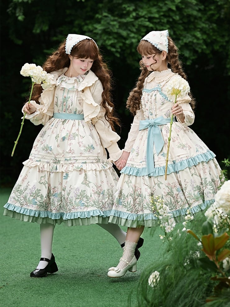 This enchanting dress features a delicate ruffled neckline, accentuated with pleating detail and adorned with charming pink fabric-covered buttons at the waist. It comes with a detachable contrasting color belt for adjustable styling. The dress showcases an original floral and bird pattern, with soft pinks and greens complementing each other beautifully. Designed in a loose fit for comfort, it offers easy wear with a button closure at the back of the neck, eliminating the need for a zipper.