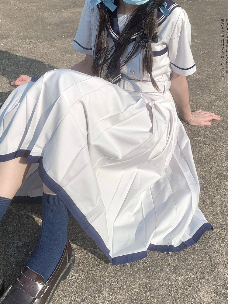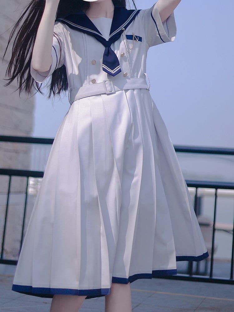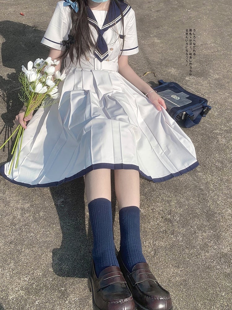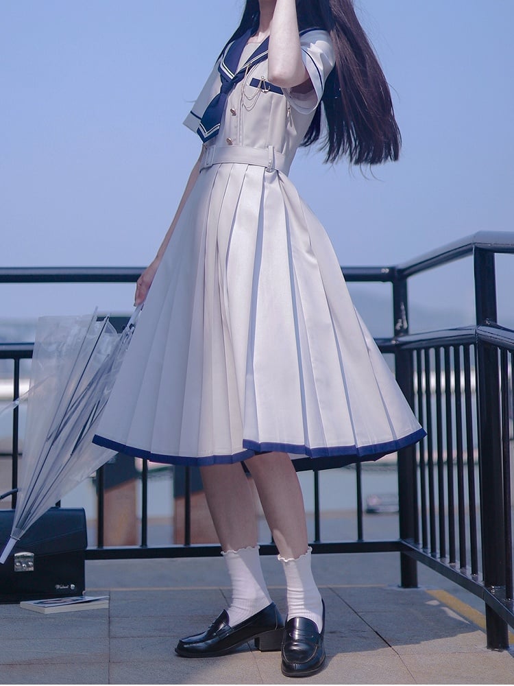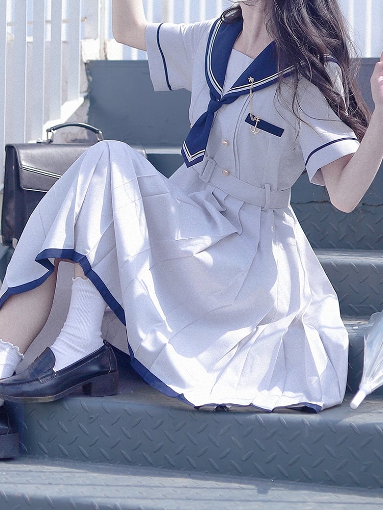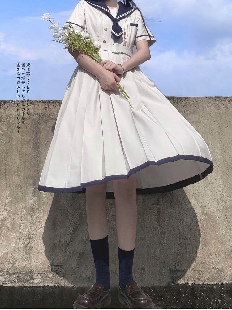 Embrace the charm of nautical fashion with our Light Gray Navycore Short Sleeves Dress. This delightful piece features a classic sailor collar, adding a touch of maritime elegance to your wardrobe. The dress is designed with a flattering box pleat that enhances its silhouette, providing both comfort and style.