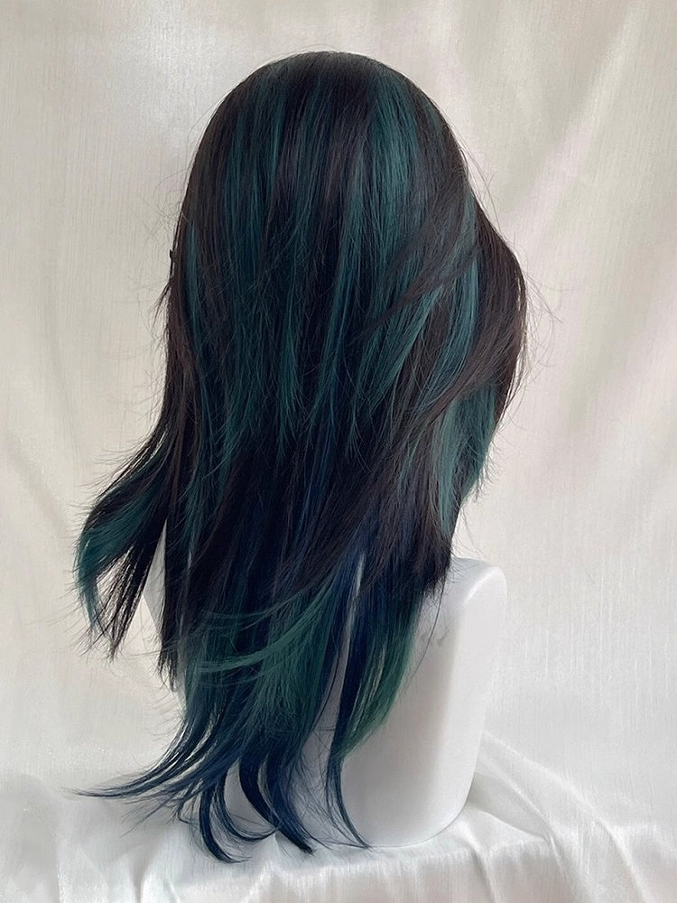 Ouji Style 55CM Blue & Green Highlight Straight Wig with Curtain Bangs creates a personalized noble boy vibe with color-block highlights, neat straight hair and lazy curtain bangs, suitable for multiple scenarios to easily achieve a subculture look.