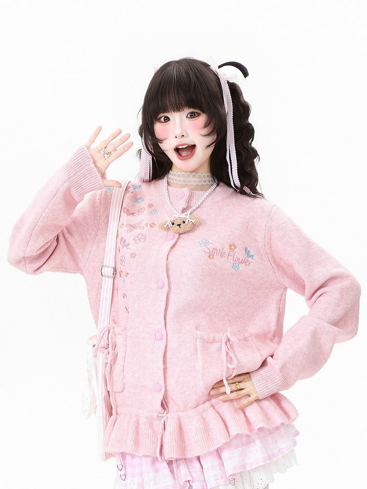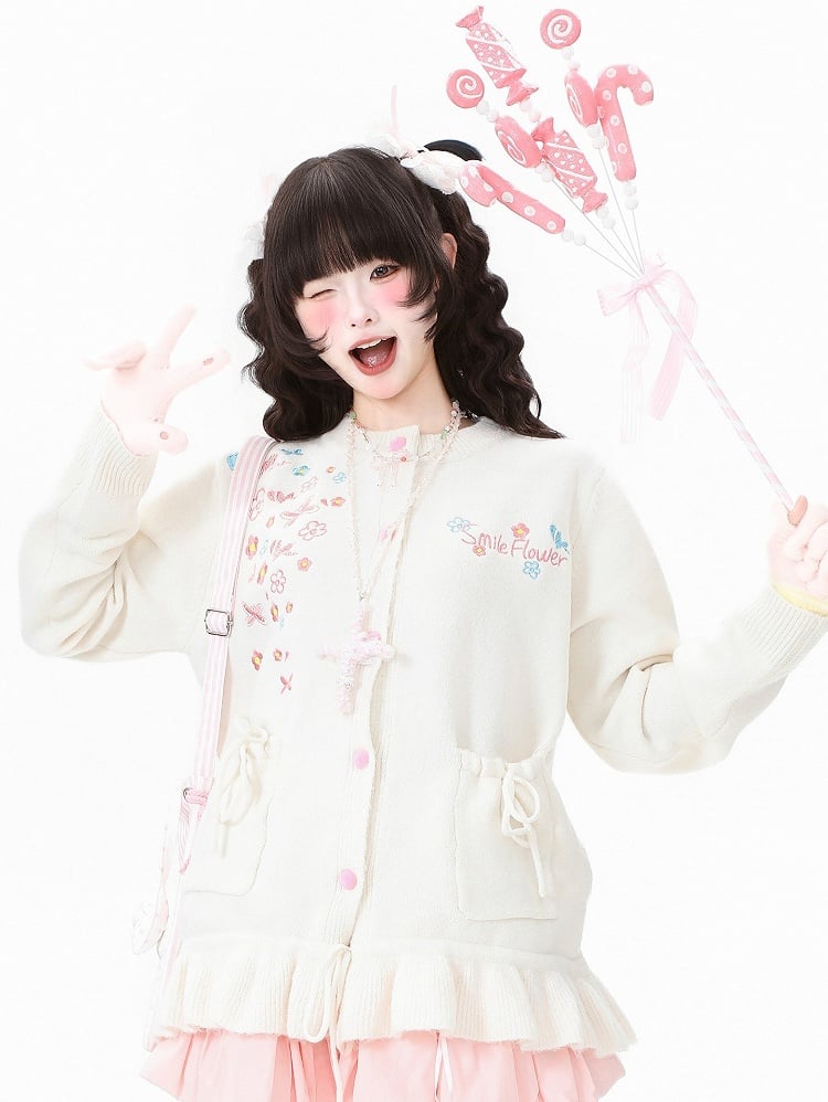 Elevate your everyday style with this adorable kawaii cardigan, designed to bring a touch of whimsy to your wardrobe. Featuring a playful ruffled hem, this cardigan is adorned with delicate letter, butterfly and floral embroidery, adding a sweet and feminine touch. The practical pocket design ensures you have a convenient spot for your essentials, while the decorative drawstrings and bow details offer an extra layer of charm.