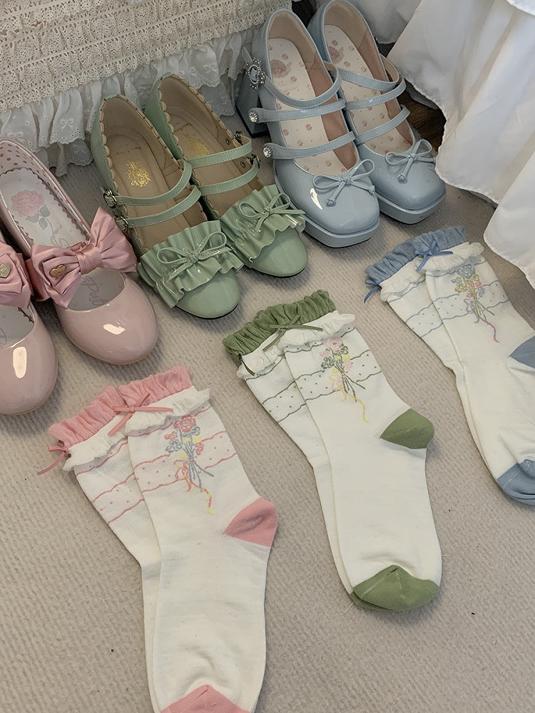 Add a touch of cuteness to your outfit with our pink/blue/green bowknots floral pattern cotton socks. These adorable socks feature a charming floral pattern and are adorned with a lovely bowknot in pink, blue, or green. Made from comfortable cotton, these socks are perfect for adding a pop of color to your look.
