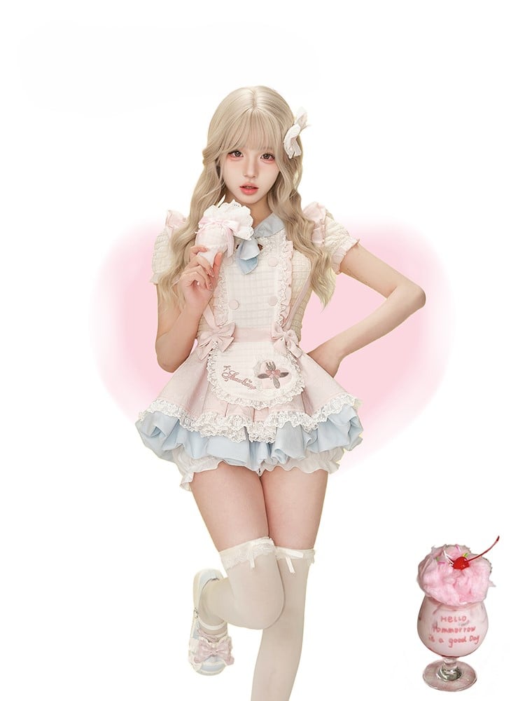 This charming overall skirt combines soft pink and blue hues with delicate lace trim, ruffle edges, and bow accents for a dreamy kawaii aesthetic. The unique embroidery featuring playful letters and cutlery motifs adds a creative touch, making it a versatile piece perfect for both casual outings and special occasions.