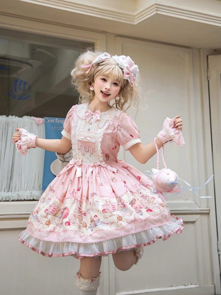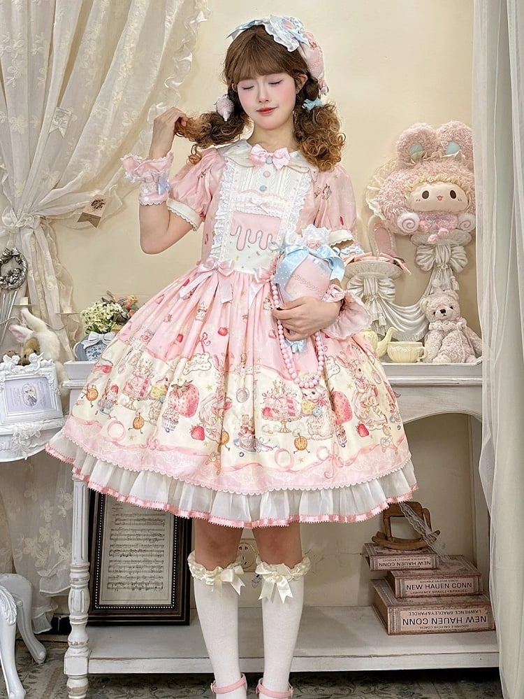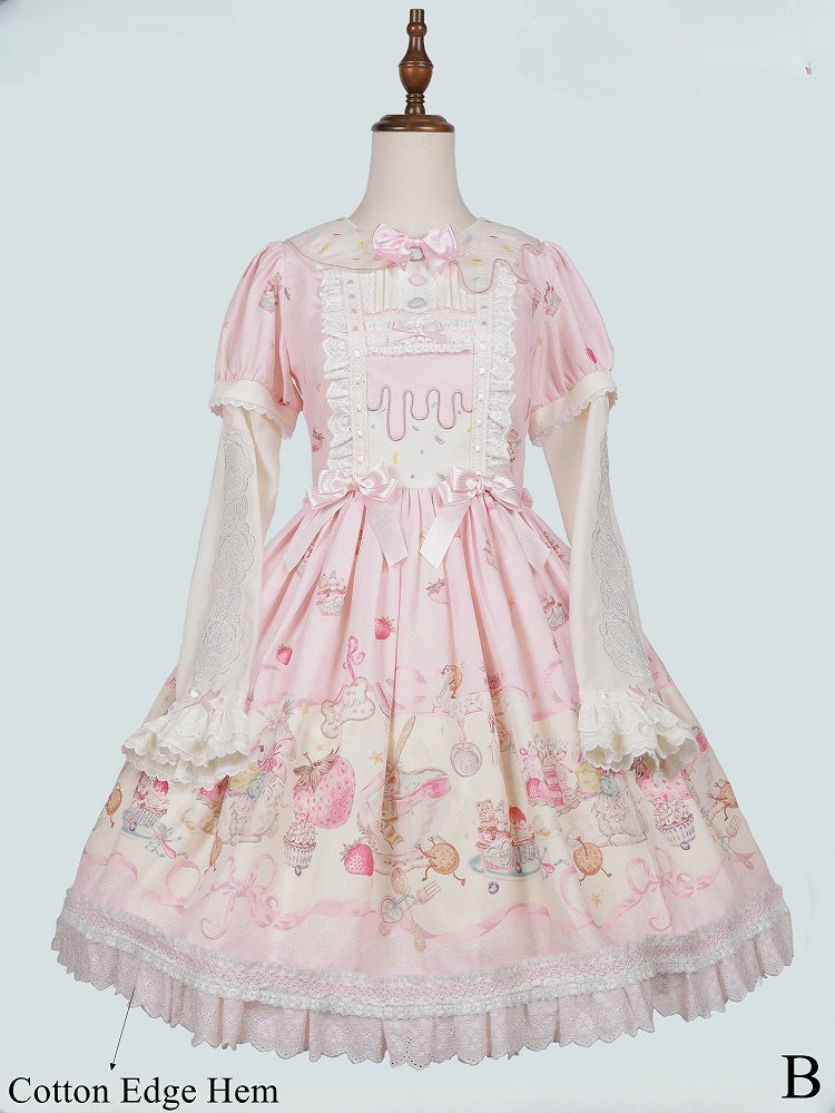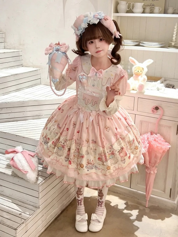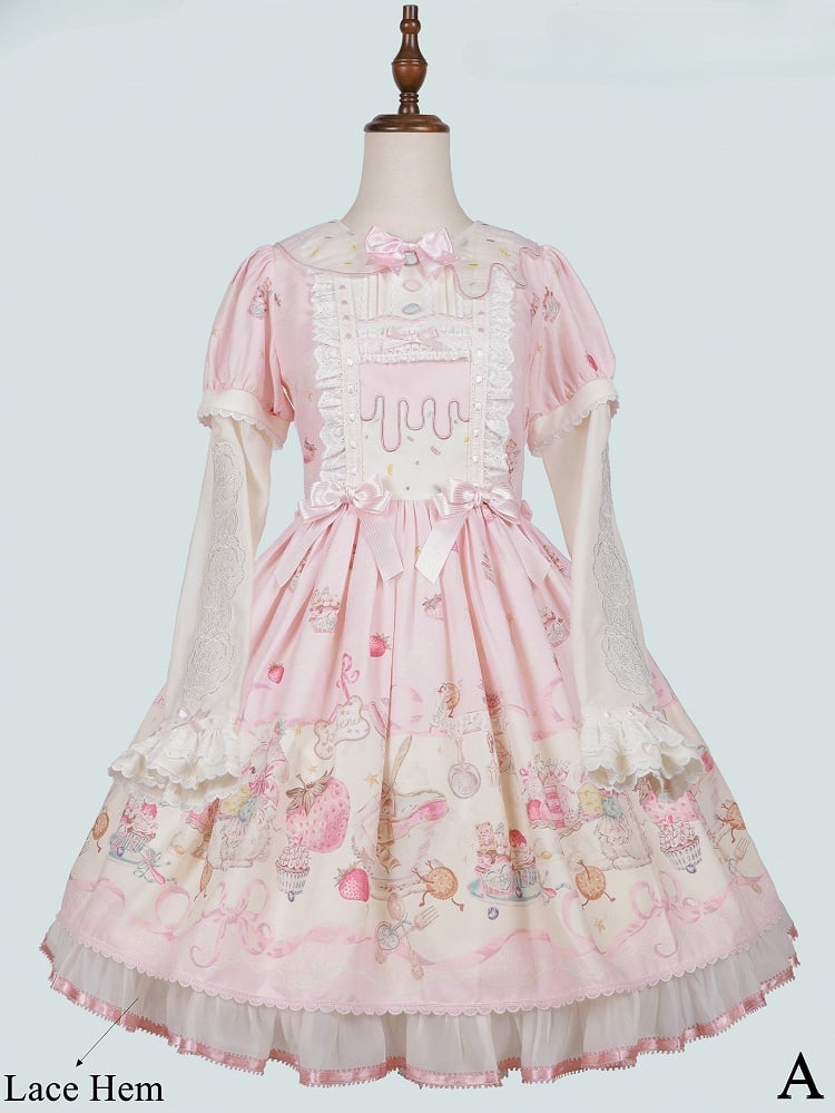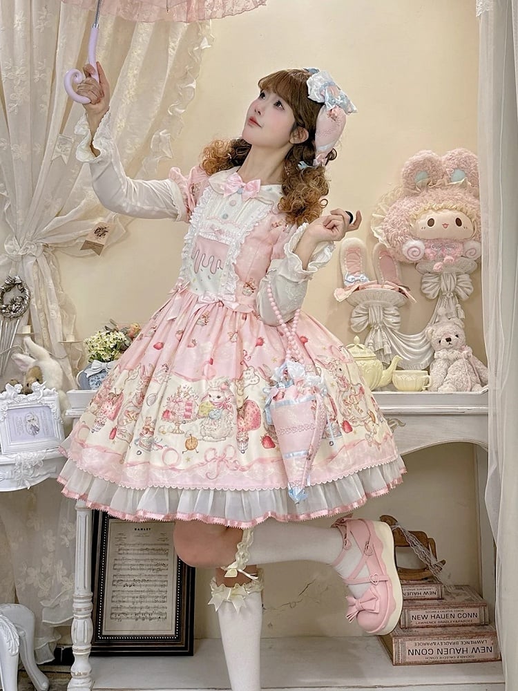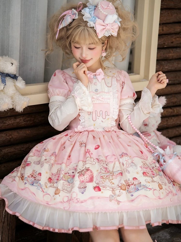 This enchanting dress features a captivating print of playful bunnies and delectable desserts, set against a soft pink backdrop that evokes a sense of dreamy innocence.Designed for versatility and personal preference, this dress is available in two exquisite versions: a delicate lace hem for an added touch of elegance, or a classic cotton trim for a more traditional Lolita look. Crafted with attention to detail, the dress boasts a flattering silhouette that embodies the essence of sweet Lolita fashion.