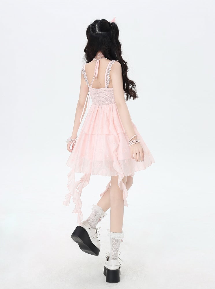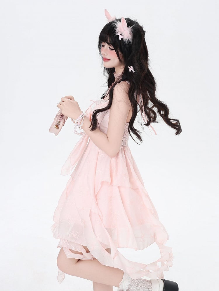 Step into a world of elegance and charm with this enchanting pink sleeveless dress. Featuring exquisite cascading ruffle accents, this dress exudes a whimsical and feminine allure. The delicate bow detail adds a touch of sweetness, perfectly complementing the soft pink hue. Crafted for comfort and style, this dress is ideal for special occasions or a day out when you want to feel like a fairytale princess.