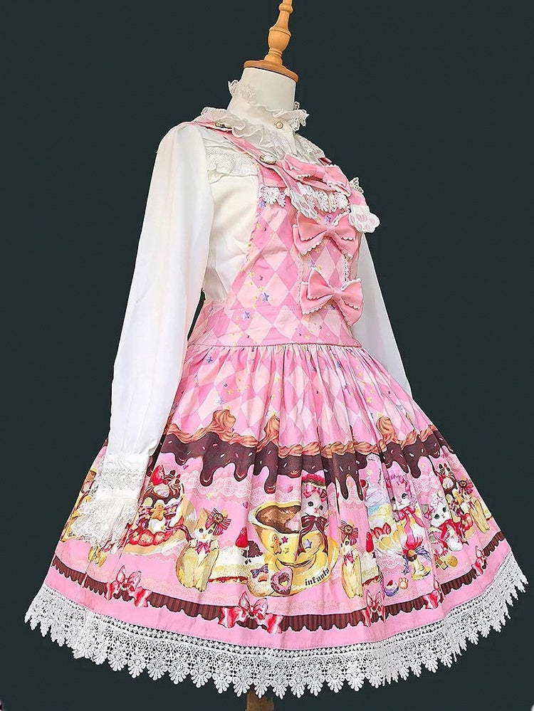 Indulge in the whimsical charm of this Sweet Pink Lolita Dress, featuring an enchanting dessert and cat print that adds a touch of playful elegance. The delicate argyle pattern in pink hues creates a classic aesthetic, perfect for sweet Lolita fashion enthusiast. This dress is further accentuated by a delightful cat ear hood, adding a whimsical and cute element to your ensemble.