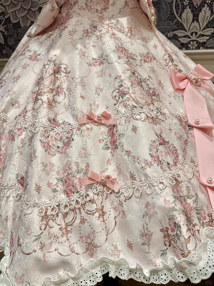 This exquisite Lolita dress features a charming floral print that exudes a sense of elegance. The dress is adorned with intricate lace trim, adding a touch of classic sophistication to its design. Thoughtfully accented with dainty bows and sparkling bead details, this dress captures the essence of Lolita fashion with a modern twist.