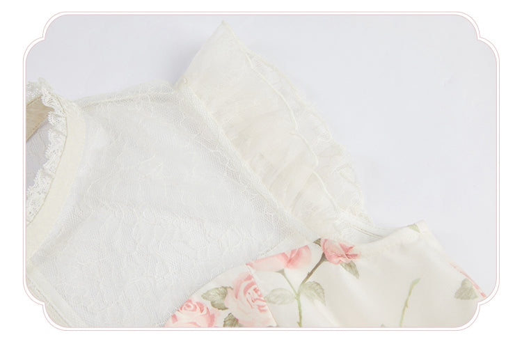 This enchanting piece, reminiscent of the delightful ensembles found in the beloved game "Miracle Nikki," features a charming rosette print that dances across the crisp white fabric. Designed for elegance and comfort, the dress boasts a rear zipper for effortless wear and a flattering silhouette with a cinched waist adorned with delicate ruffle trim. The double-layered flutter sleeves add a touch of playful sophistication, making it perfect for summer outings or Lolita gatherings.