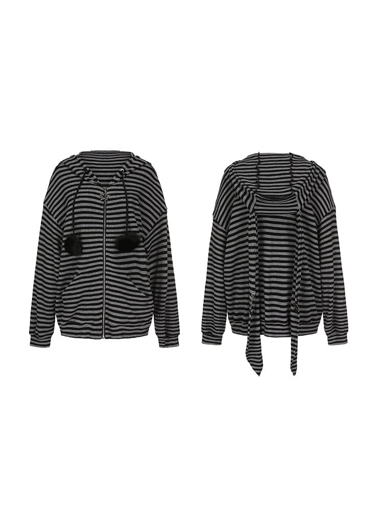 This long-sleeve hoodie jacket features a gray base with black stripes and adorable bunny ears on the hood. The black drawstrings are accented with black pompons, while the zipper closure is uniquely designed with a star-shaped pull.