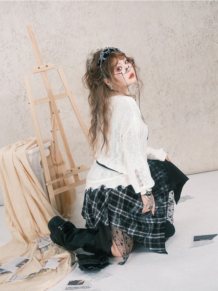 Step into the edgy side of fashion with this plus-size subculture-inspired black asymmetrical handkerchief hem skirt. Featuring a PU waistband adorned with stud details, this skirt boasts layers of intrigue: a black handkerchief hem overlay with intricate black lace star embroidery at the innermost layer, topped with a chic black-and-white plaid fabric. Designed to fall just below the knee, this skirt perfectly balances boldness and elegance.
