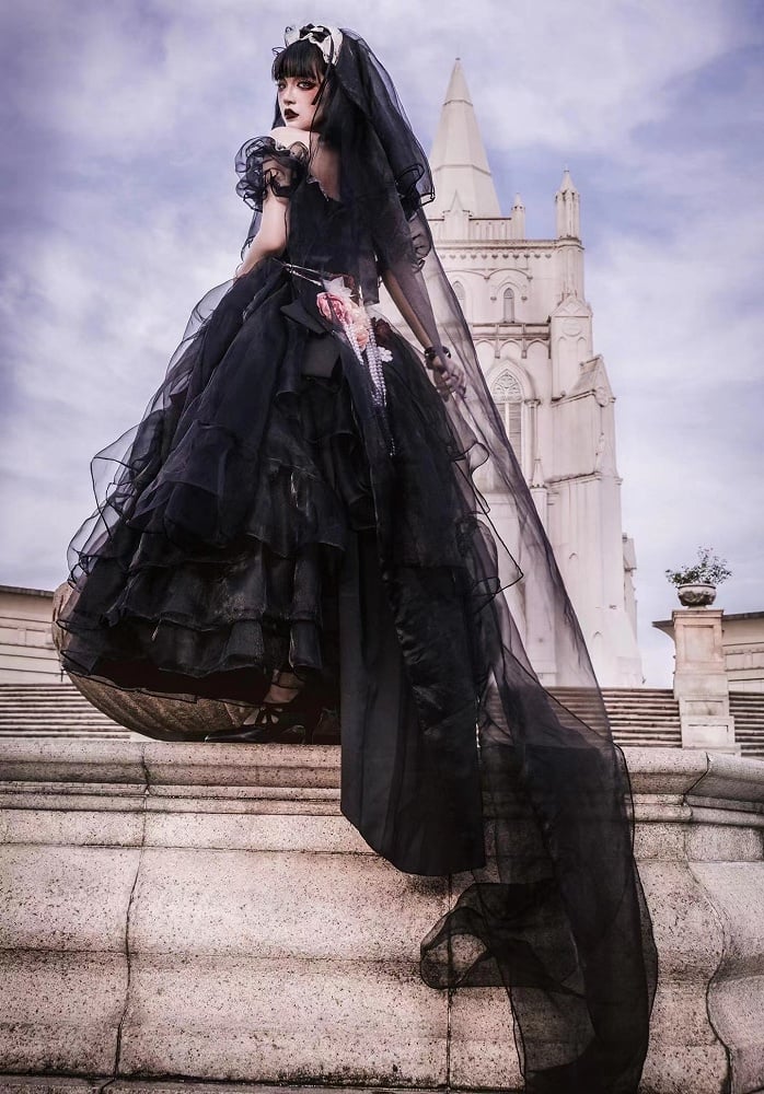 Full set includes the rosette long black dress, a floral and beads chain bow train, a long black veil, a white floral KC, and a FREE petticoat.