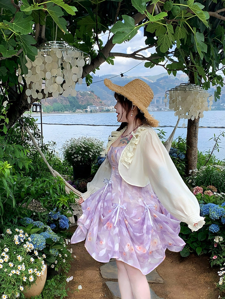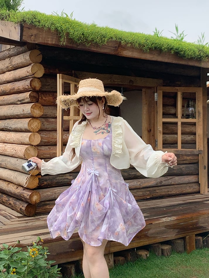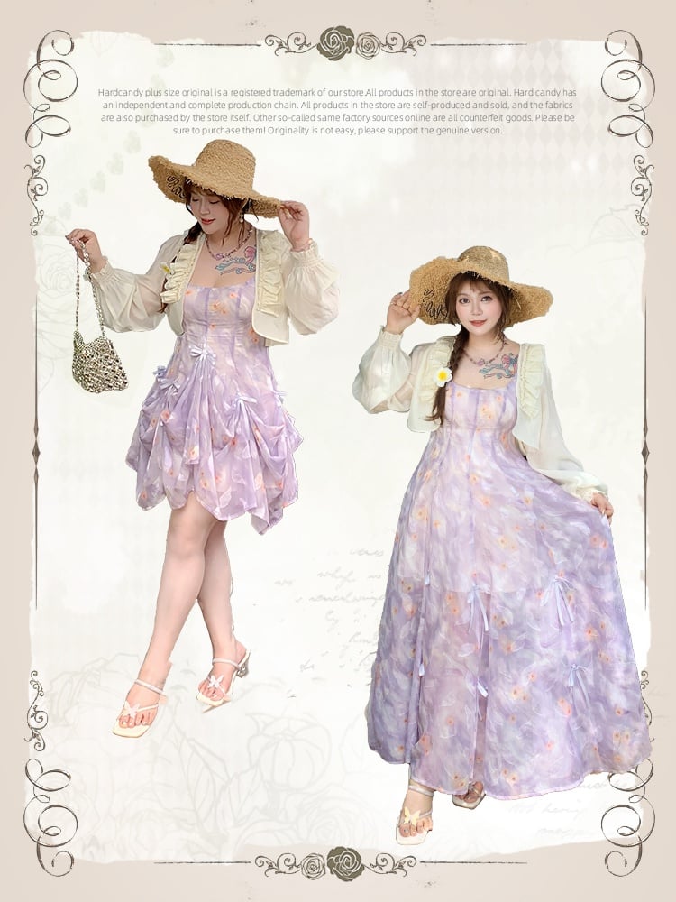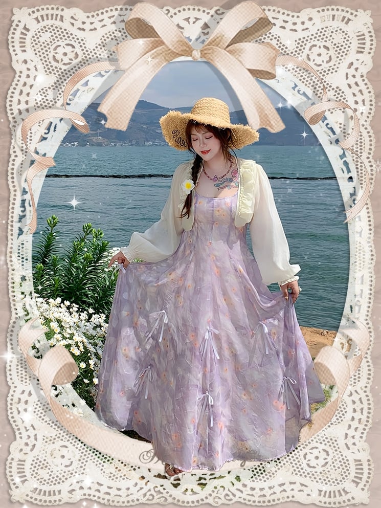 Embrace your inner romantic with this enchanting plus-size cami dress, featuring a delightful purple hue adorned with dainty floral prints. Crafted from lightweight chiffon, this dress is designed to flow gracefully with every step, offering both comfort and style. The charming bowknot details add a touch of whimsy, making it perfect for any occasion where you want to feel both elegant and playful.