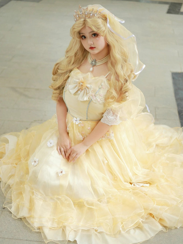 Pearl-embellished bow at the bodice, adding a refined, princess-style touch