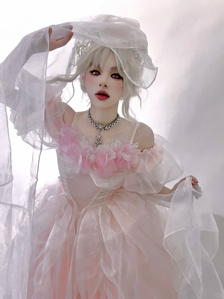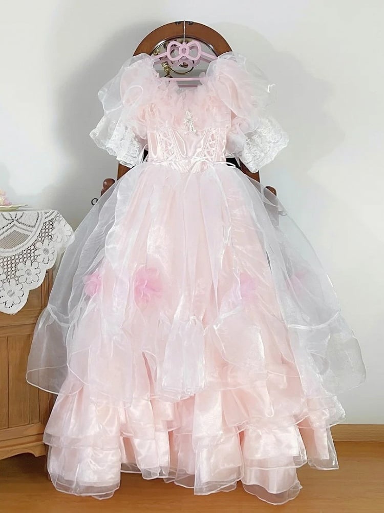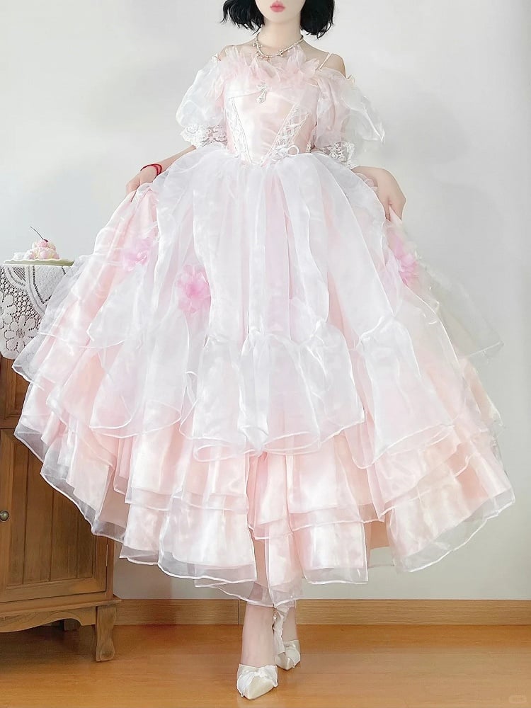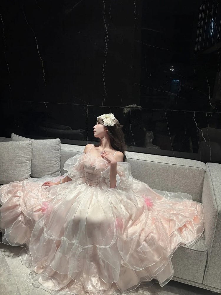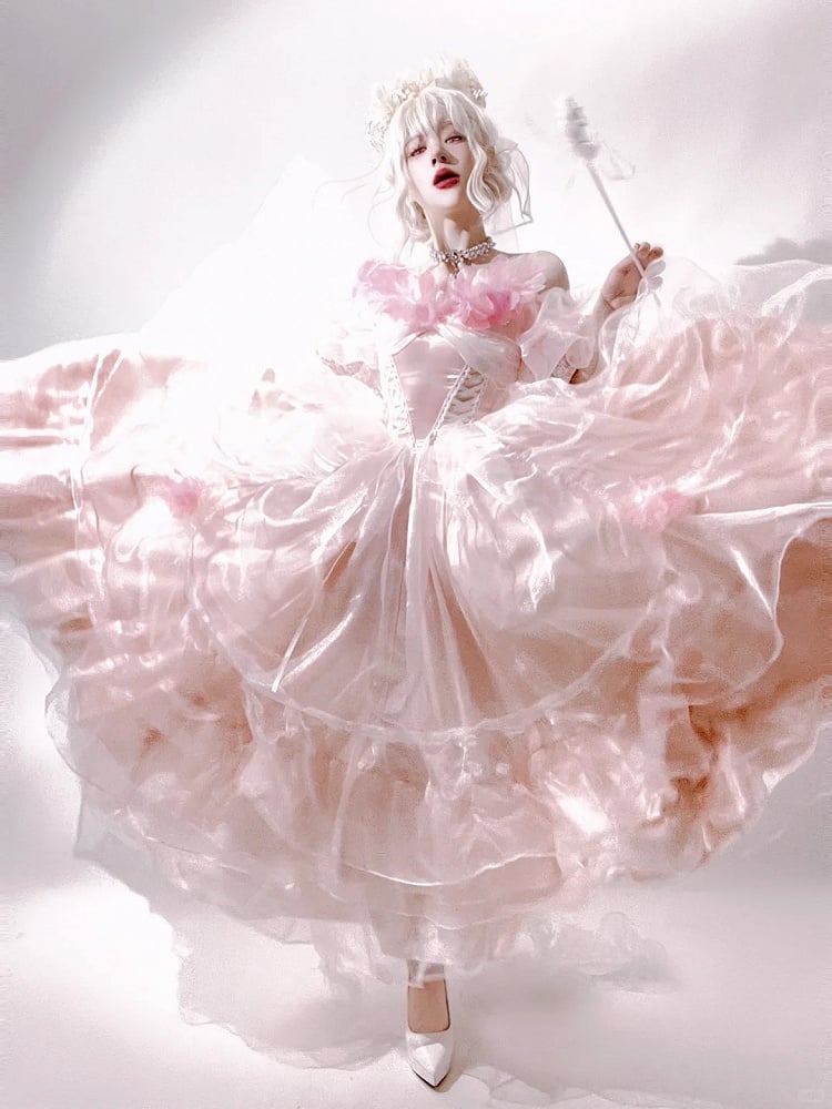 This exquisite dress features a versatile neckline that can be worn off-the-shoulder or pulled up for a short-sleeve look, adorned with floral decorations around the neckline.The fully elasticized back ensures a comfortable and flattering fit for all body types. Perfect for special occasions such as quinceanera and weddings, this dress combines the charm of Lolita fashion with the delicate aesthetics of kawaii style, making you feel like a true princess.