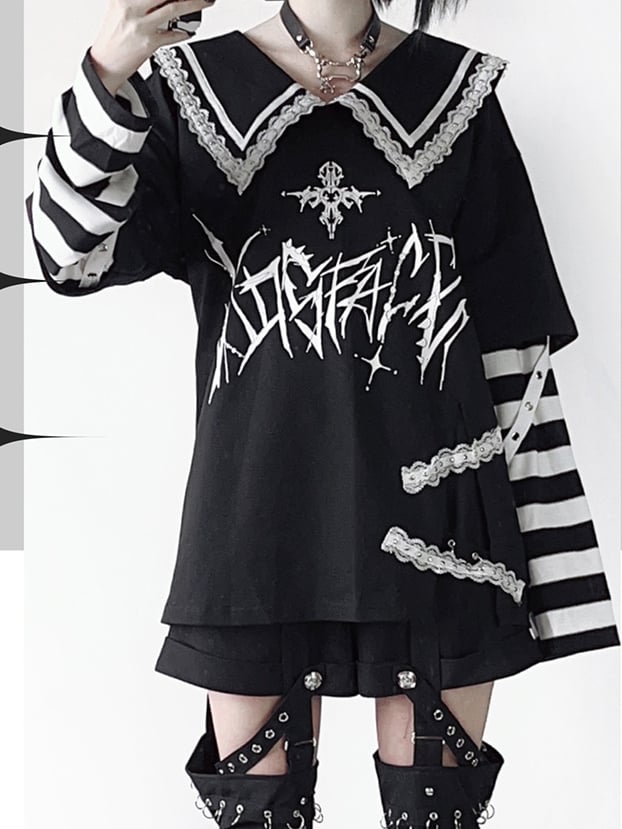 Elevate your wardrobe with this enchanting top that seamlessly blends classic sailor style with a touch of whimsy. Featuring a pointed sailor collar adorned with delicate lace embellishments, this piece offers a playful yet sophisticated look. The unique print adds a dash of personality, while the contrasting striped sleeves provide a contemporary twist.