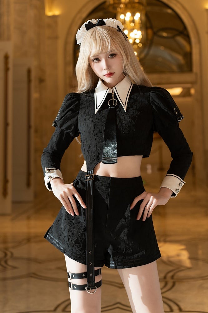 Constract white color pointed collar long juliette sleeves cropped top, special designed tie zip pull, irregular hem with PU strip decoration.