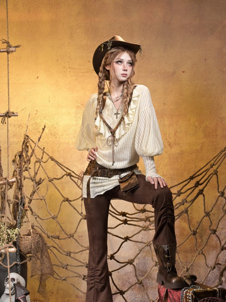 Punk Retro Bishop Sleeves Knit dress: Featuring a sexy brown PU deep V-neck with rope lacing and vintage bell charm, this beige piece boasts thumbhole cuffs. The neckline is adorned with ruffled edges, while the hemline showcases intricately cut jacquard lace for an elegant touch. Versatile two-way design for a chic look.