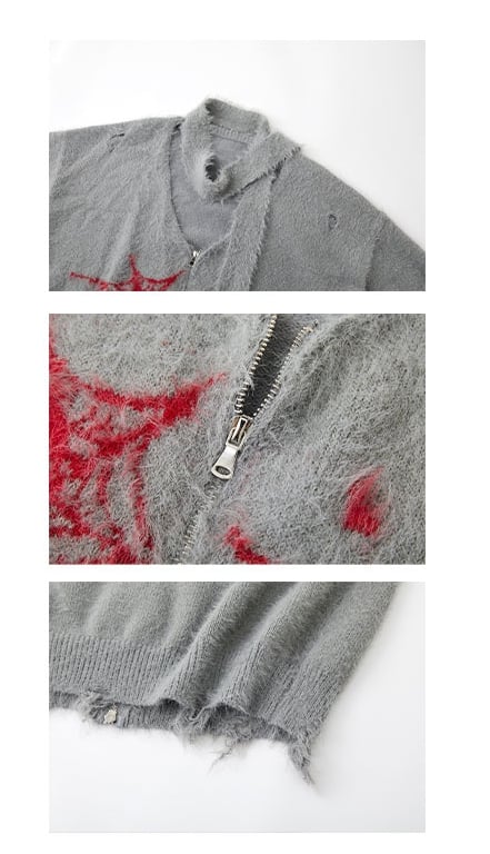 Step into a realm of chic mystery with our V-neck cardigan, adorned with intricate red spider web embroidery that weaves a tale of elegance and edge. This striking piece features a convenient zip closure, allowing for versatile styling and easy wear. The distressed holes add a touch of rebellious flair. Designed with a loose fit, it offers comfort and style in equal measure, making it an ideal layering piece for any season. To top it all off, this cardigan comes with a matching scarf, completing your look with coordinated charm.