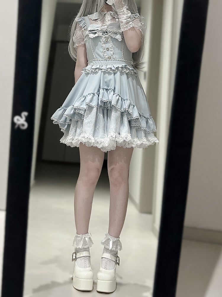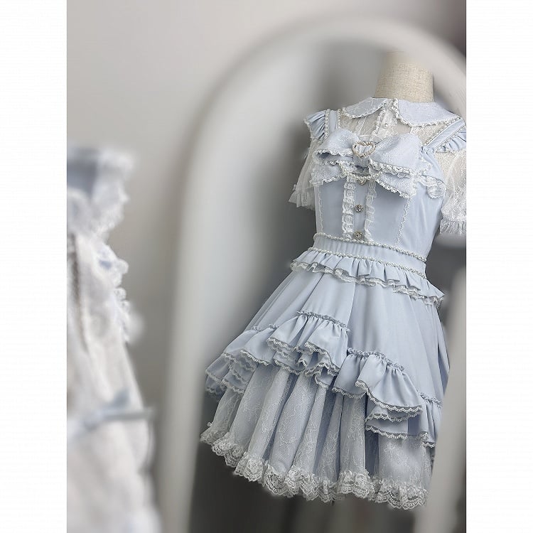 Step into a world of whimsical elegance with this enchanting Jirai Kei light blue jumper skirt ensemble. The upper bodice is adorned with heart-shaped rhinestone embellishments, adding a touch of sparkle and charm. Beaded details gracefully accentuate the waist, creating a flattering silhouette. The double-layered skirt flows beautifully, offering a dreamy and ethereal appearance.