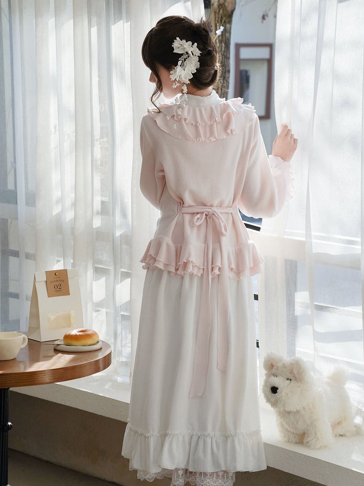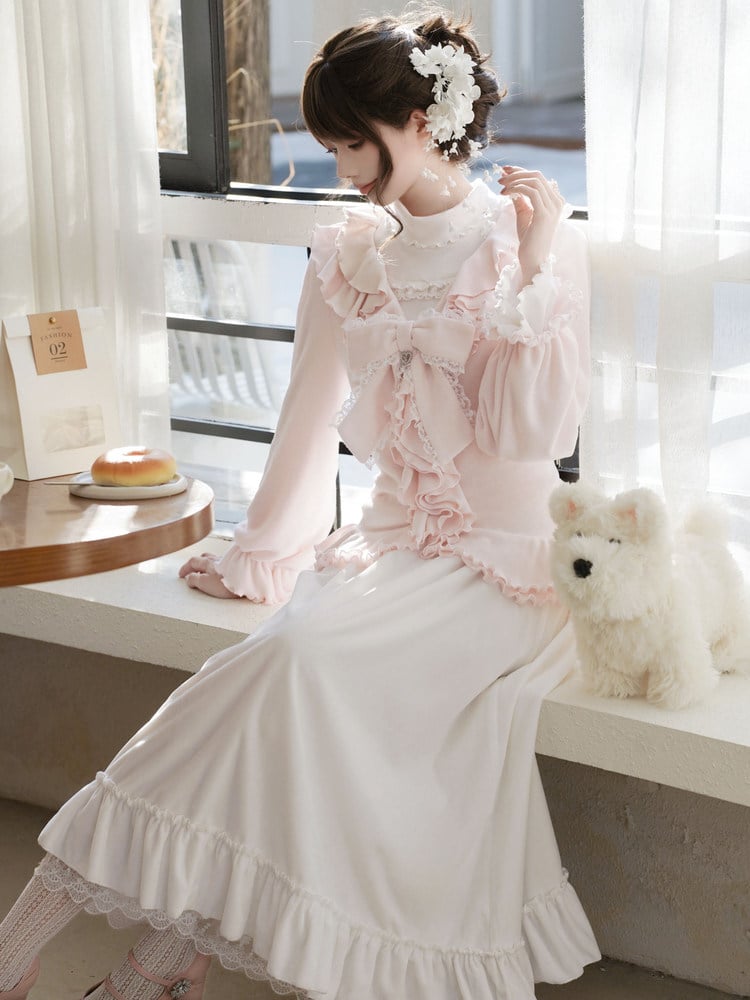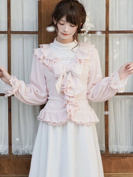 This is a Jirai Kei cardigan with pure sweet-gloomy vibes, featuring a soft mist pink base color and covered in ruffle details. The chest bow is the key sweet accent, with subtle gloomy atmosphere hidden in the delicate details. It has a loose silhouette that doesn’t feel bulky—layer it with camisoles or base layers for a layered look, or wear it alone for a delicate style, making it a practical overlay piece for daily sweet-gloomy outfits.