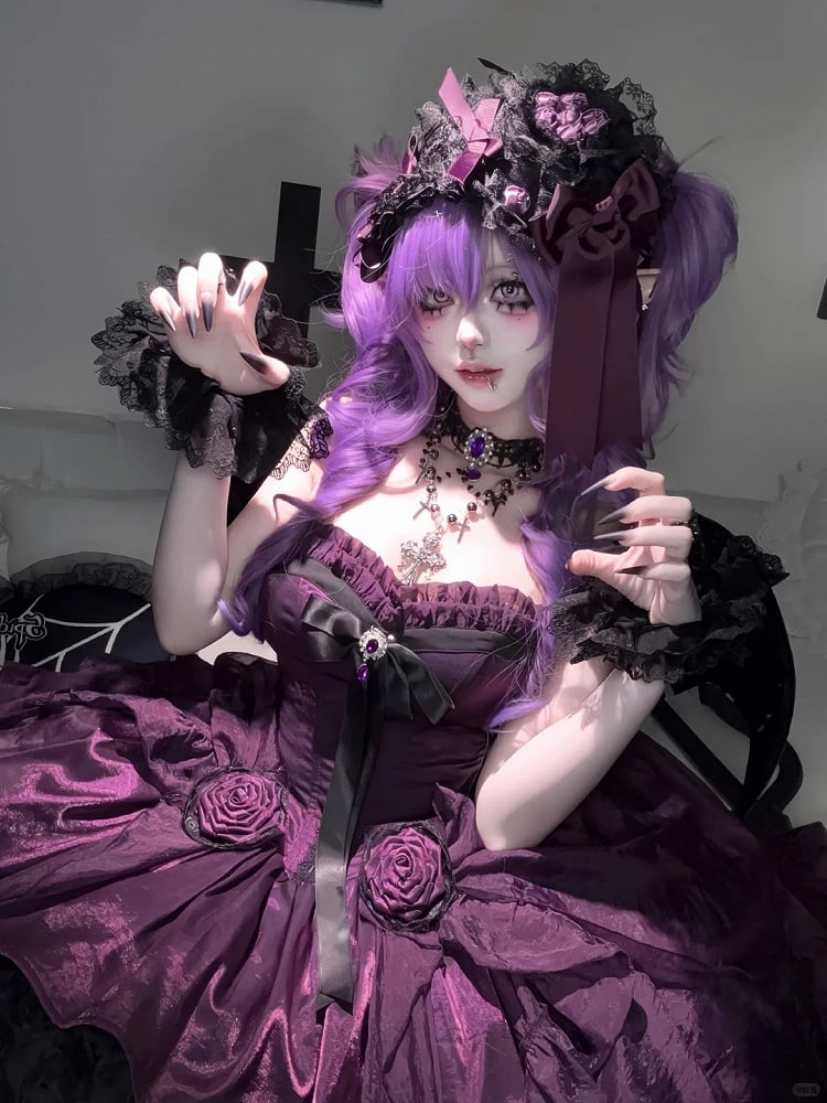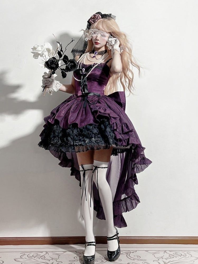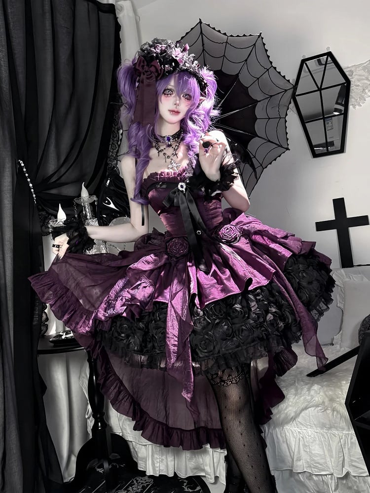 Unleash your inner gothic princess with this stunning Gothic Lolita dress, featuring a striking combination of purple and black hues. The dress boasts a structured fishbone corset that cinches the waist for a dramatic silhouette, embodying elegance and mystery. The exquisite rose bouquet hem, adding a touch of romantic flair. Designed with versatility in mind, the dress comes with detachable shoulder straps, allowing you to customize your look for any occasion.