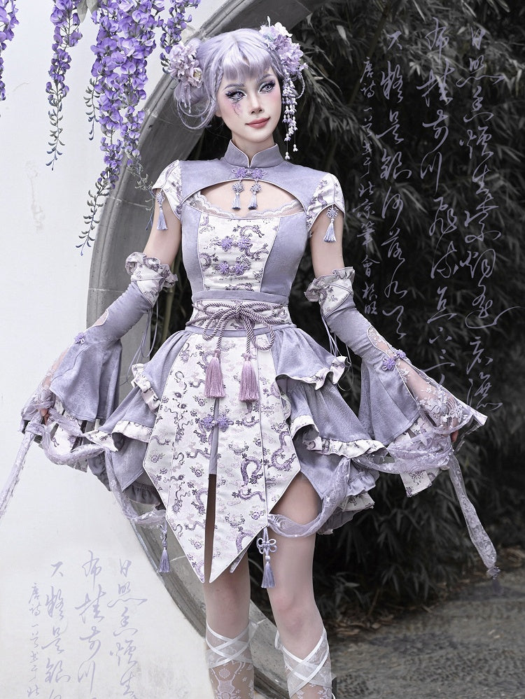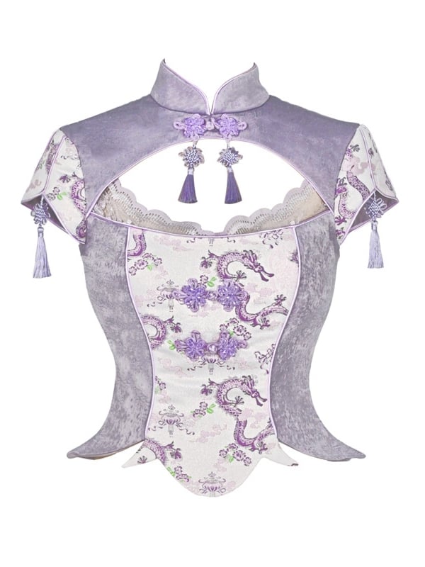 This top features a striking dragon print on a rich purple background, with a traditional cheongsam collar and short sleeves for a modern twist. The tassel charm decoration adds a touch of elegance and playfulness to this unique piece. Perfect for adding a touch of oriental flair to your wardrobe.