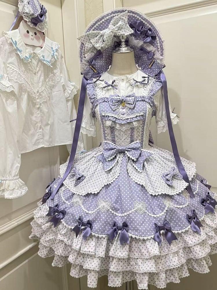 This exquisite JSK (Jumper Skirt) features a delightful purple and white polka dot pattern, creating a sweet and feminine aesthetic. The bodice is adorned with multiple dainty bows and intricate lace details, adding a touch of elegance and charm. Designed for comfort and a perfect fit, the back of the dress incorporates elastic smocking combined with a functional lace-up feature. The skirt flares out into a multi-layered design, embellished with more bows for a cohesive and enchanting look.