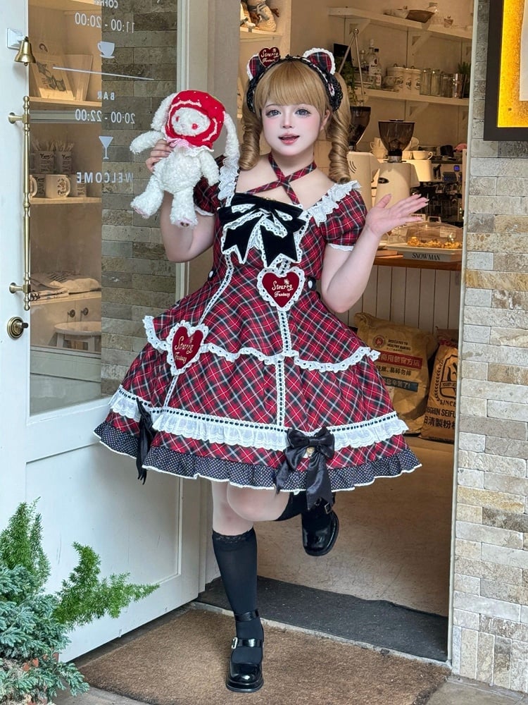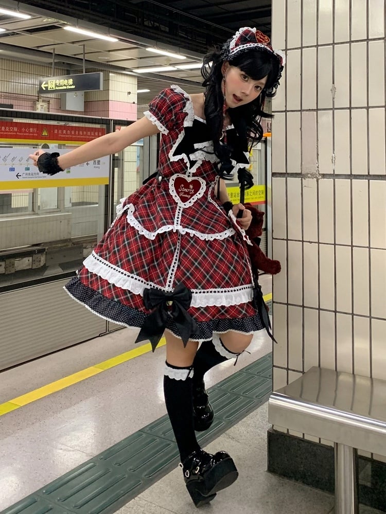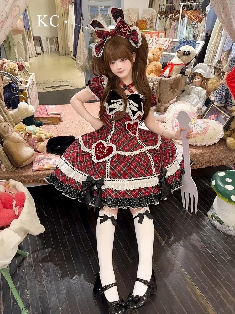 Embrace your sweet side with this enchanting Lolita dress, featuring a charming red and black plaid pattern. The puff sleeves add a touch of whimsical elegance, while the adorable sweetheart appliqué enhances its sweet and playful appeal. Perfect for those who adore the sweet aesthetic, this dress is a delightful blend of classic Lolita style with a modern twist.