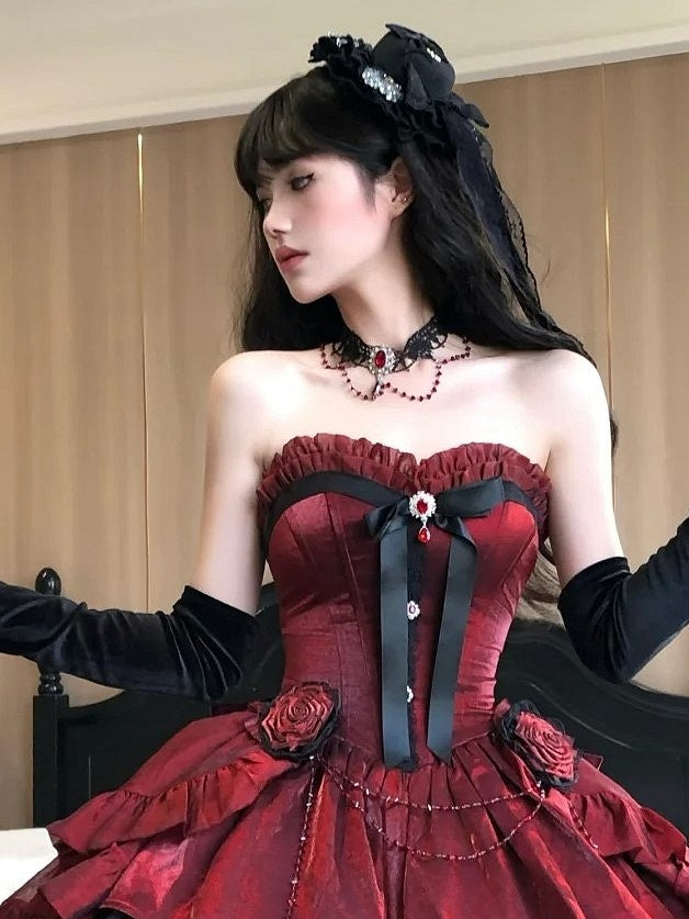 Elevate your Gothic Lolita ensemble with this exquisite lace detail necklace, adorned with shimmering rhinestones in your choice of red, blue, or purple. This piece captures the essence of elegance and mystery, featuring lace patterns that add a touch of delicacy. The dazzling rhinestones bring a pop of color and sparkle, making it a perfect accessory for Gothic-inspired outfit.