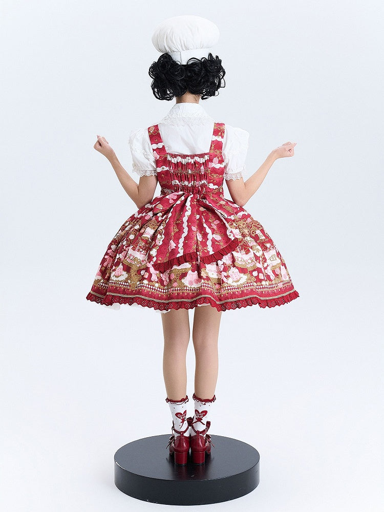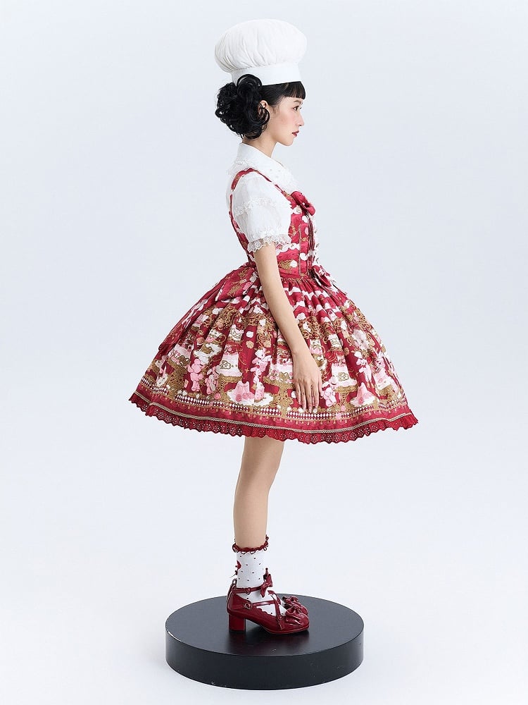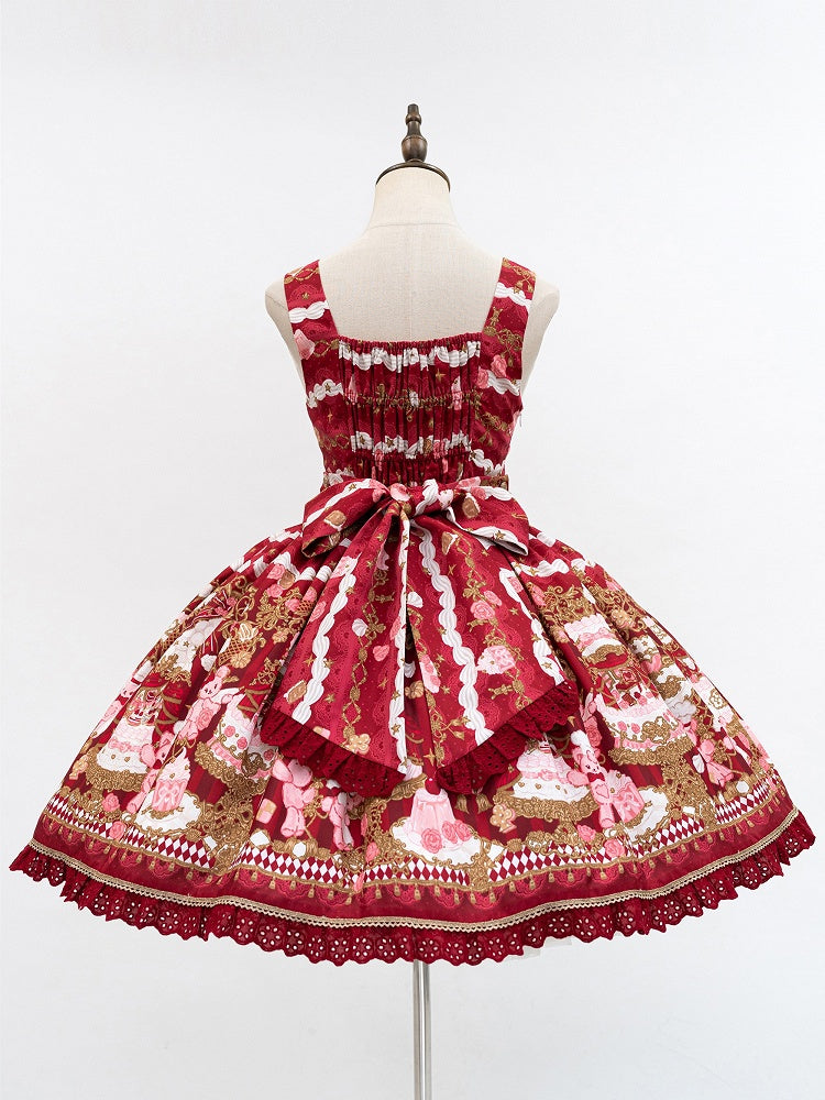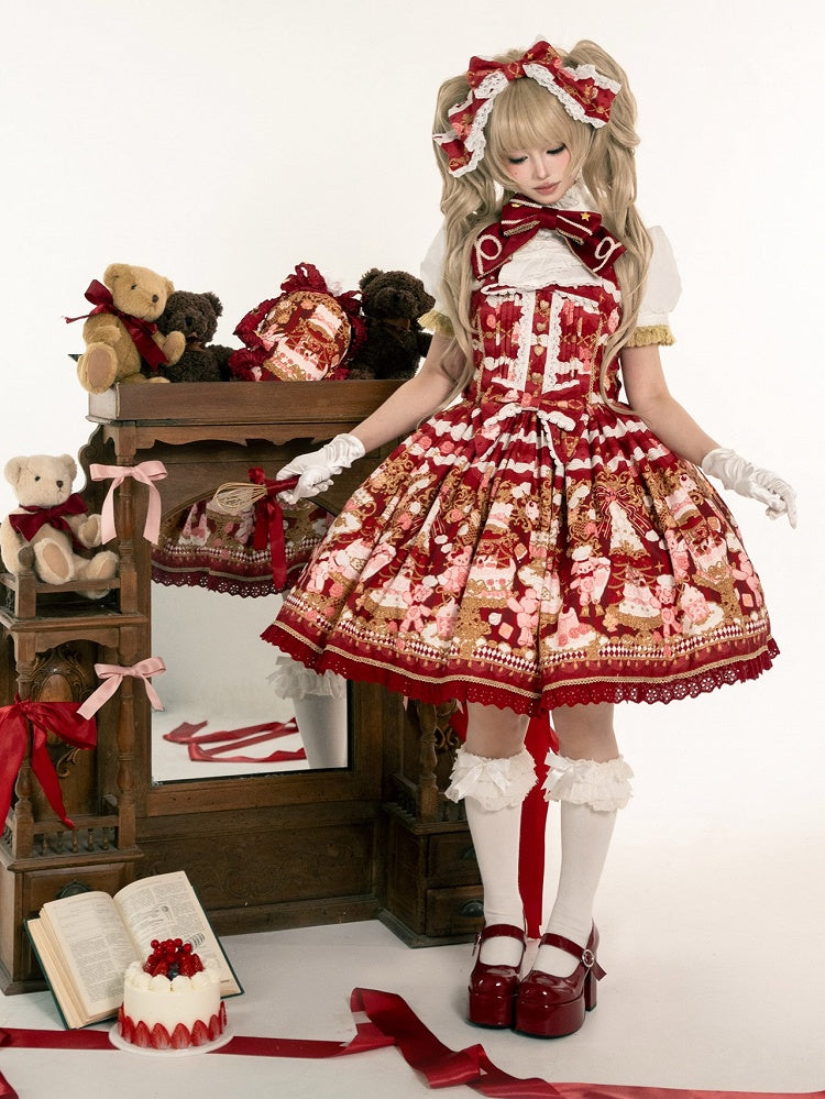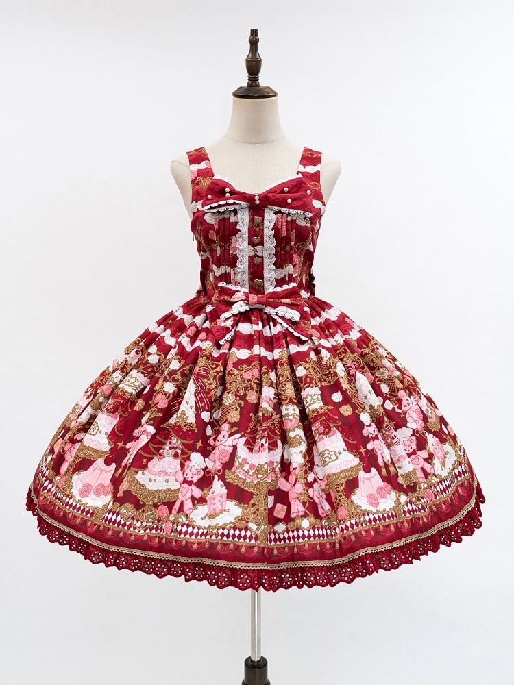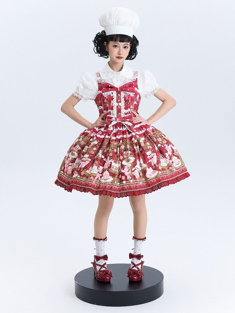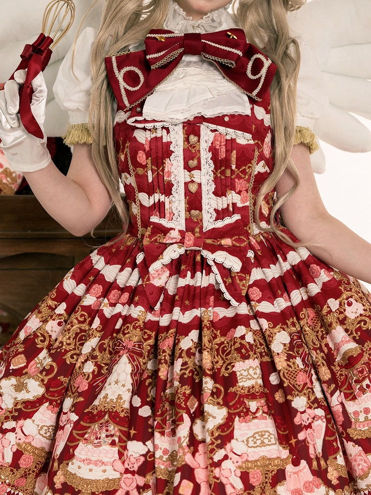 Indulge in sweetness with our Cake and Bear Print Sweet Lolita JSK Dress, adorned with delicate lace trim and charming bow details. The lace and carefully placed bows add a touch of delicacy, while the adorable cake and bear motifs bring a sense of youthful charm. Ideal for tea parties or any Lolita gathering, this dress is a must-have addition to your wardrobe.