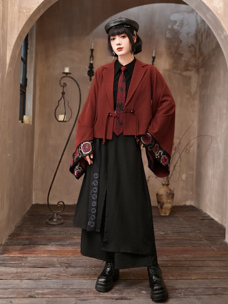 Red Short Cheongsam Style Blazer with Notched Collar, featuring padded shoulders and wide Han-style sleeves. The black cuffs showcase intricate gold woven crow patterns, and the metal bead buttons are adorned with traditional tassel decorations.