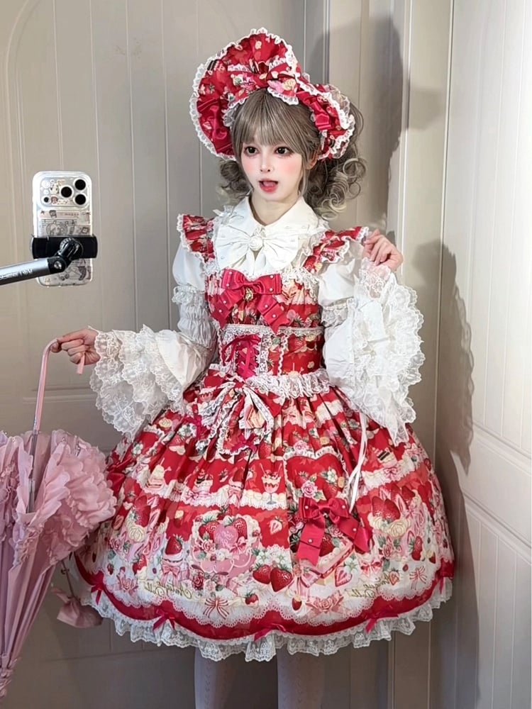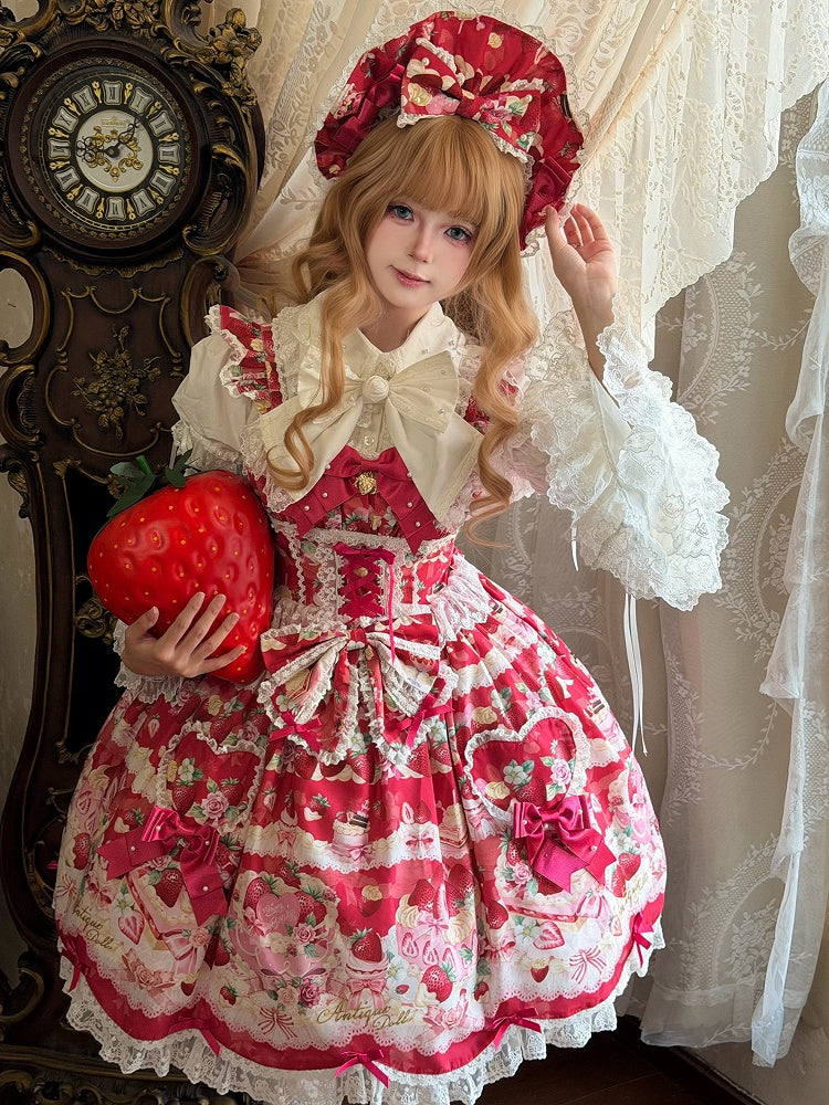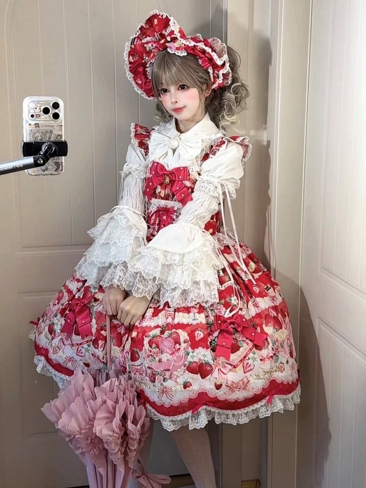 This dress features fluttering sleeves and scalloped edge trim, adorned with sweetheart appliqués that add a touch of elegance. The playful strawberry cake print brings a dash of fun and color, perfect for those who adore a touch of sweetness and fantasy in their wardrobe. Delicate bows and lace accents complete this look, making it an ideal choice for Lolita enthusiasts who appreciate the finer details.