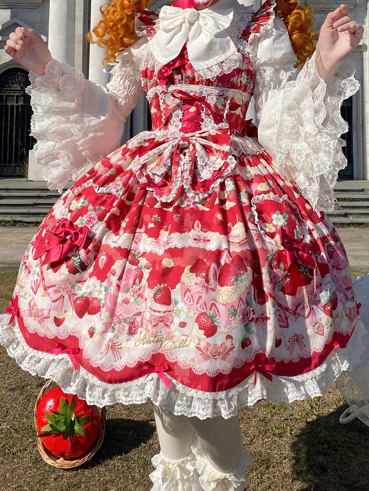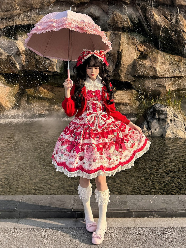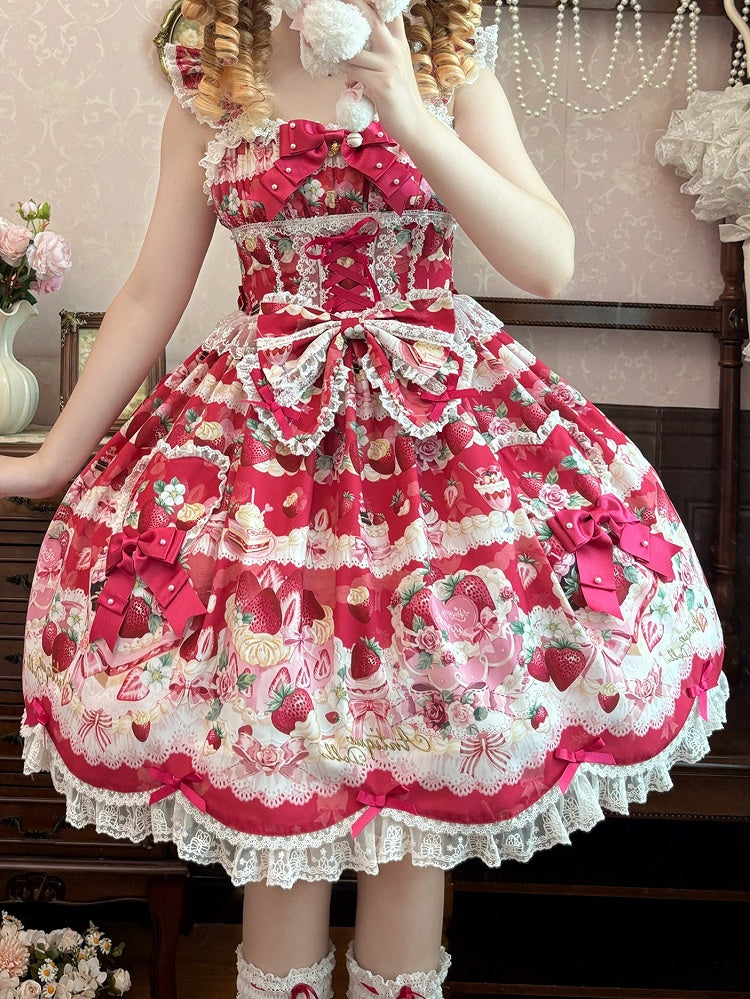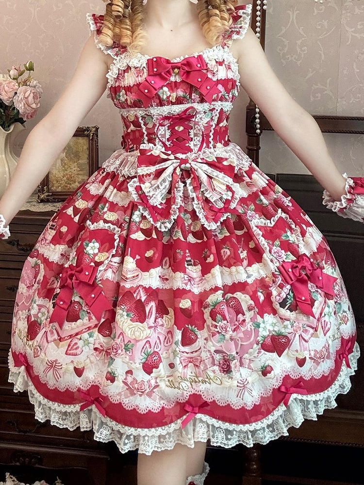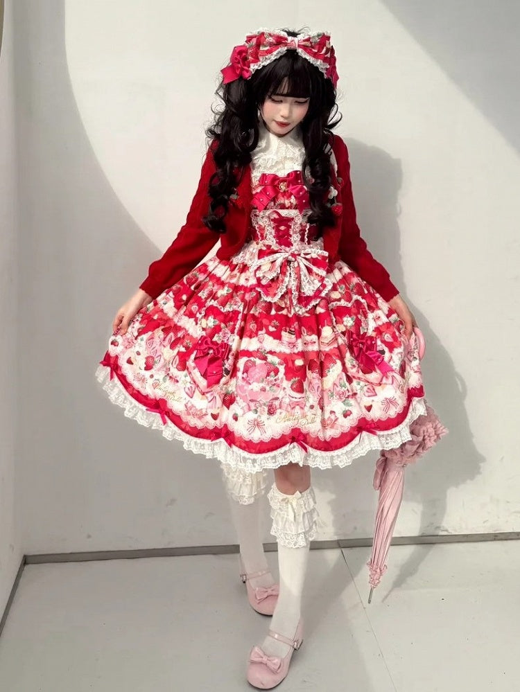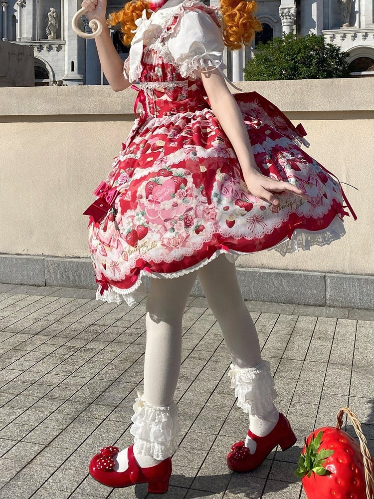 This dress features fluttering sleeves and scalloped edge trim, adorned with sweetheart appliqués that add a touch of elegance. The playful strawberry cake print brings a dash of fun and color, perfect for those who adore a touch of sweetness and fantasy in their wardrobe. Delicate bows and lace accents complete this look, making it an ideal choice for Lolita enthusiasts who appreciate the finer details.