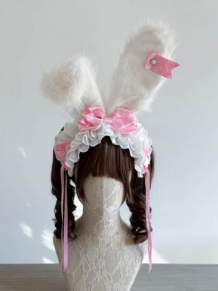 This Hairband features adorable plush bunny ears that add a whimsical touch to any outfit. The design is adorned with a delightful polka dot bow, bringing a pop of classic charm to the piece. Delicate lace trim enhances its appeal. Ideal for those looking to infuse their style with a hint of cuteness and sophistication, this headband is a must-have for any Lolita fashion enthusiast.