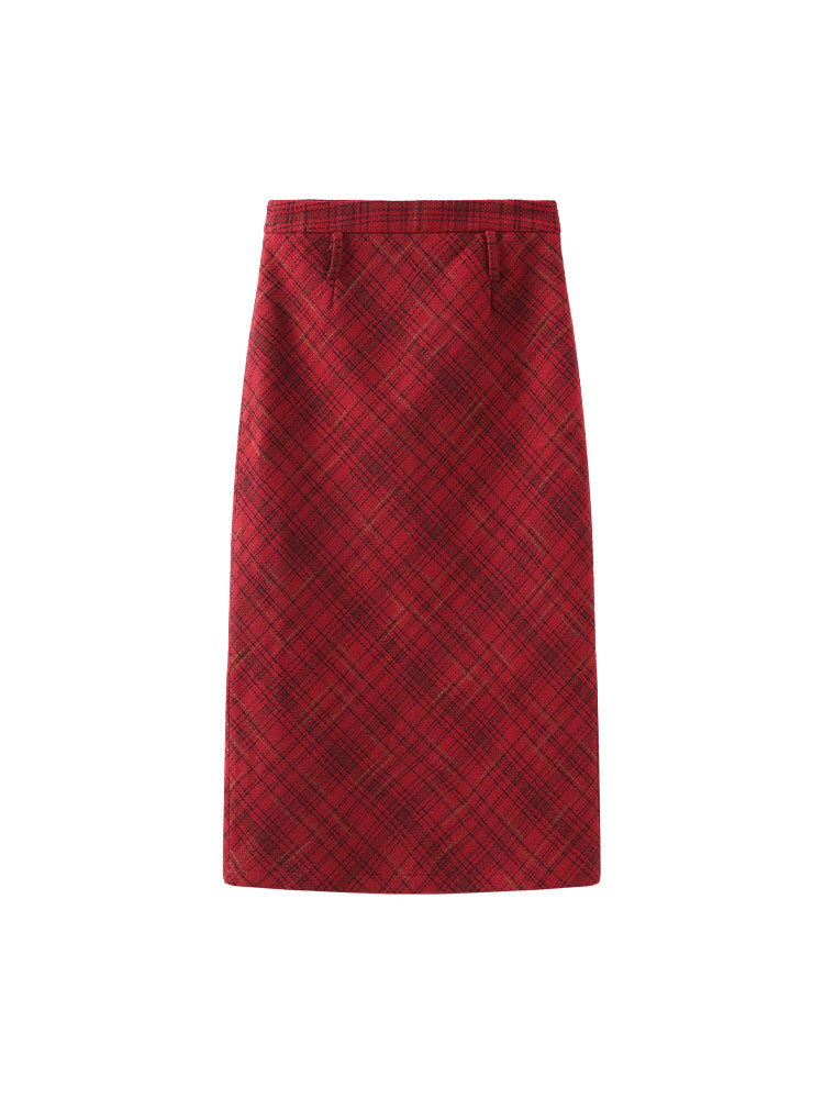 Red Plaid High-Waist Midi Skirt: This chic and cozy skirt is perfect for fall and winter. Featuring a flattering A-line silhouette, it offers a sleek fit with a side zipper and a stylish back slit at the hem. Designed to hit mid-calf, it effortlessly combines warmth and elegance.