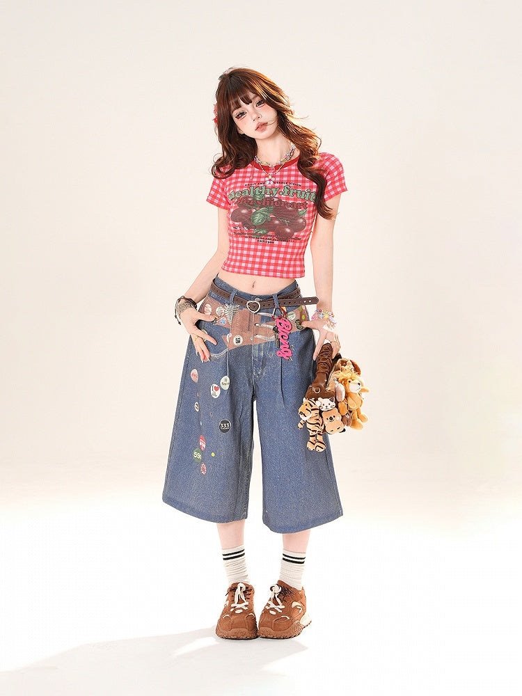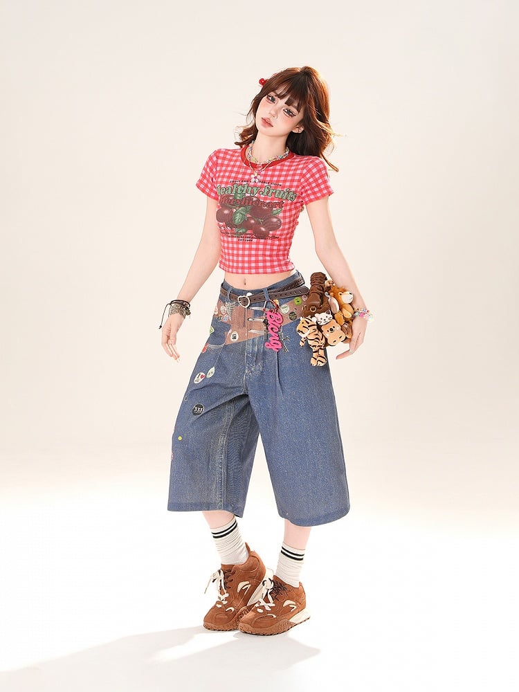 Dive into a world of playful charm with this adorable cropped t-shirt, featuring a delightful fruit print that perfectly captures the essence of sweet summer days. The classic plaid pattern adds a touch of vintage flair, while the cropped cut ensures a trendy silhouette. Ideal for pairing with high-waisted jeans or skirts, this t-shirt is a must-have for anyone looking to infuse their wardrobe with a splash of fun and color.