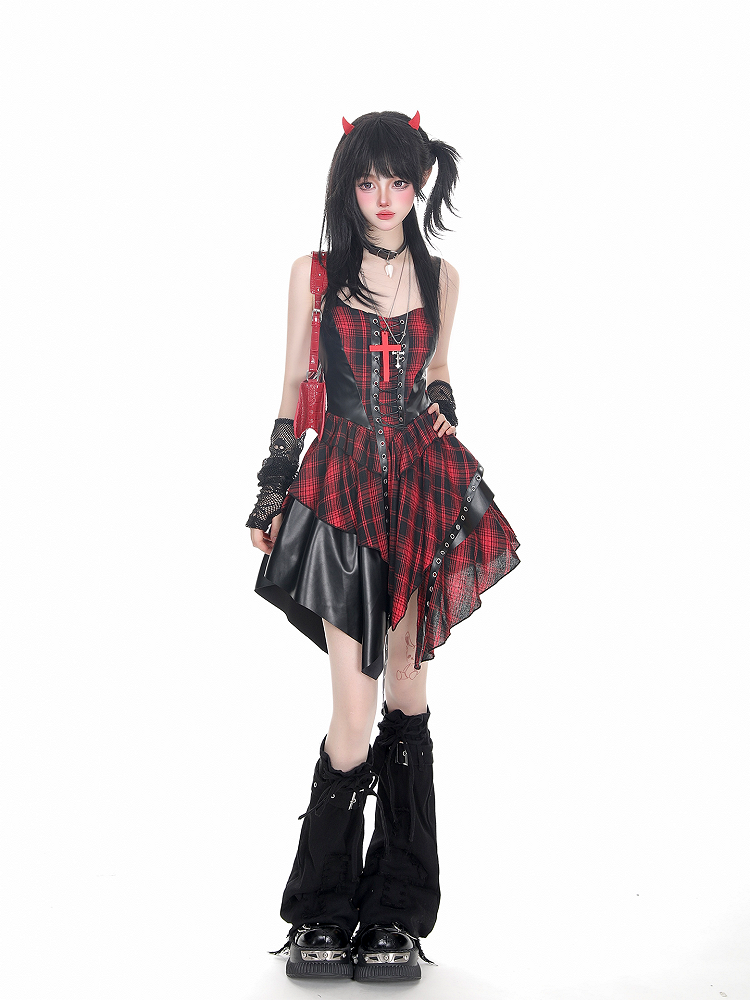 Unleash your inner rebel with this striking red punk rock-inspired cami dress. Featuring a bold plaid pattern, this sleeveless beauty is designed to turn heads. The lace-up detail at the bust adds a touch of intrigue, while the patchwork and strap accents give the skirt a unique, edgy flair.