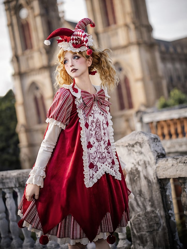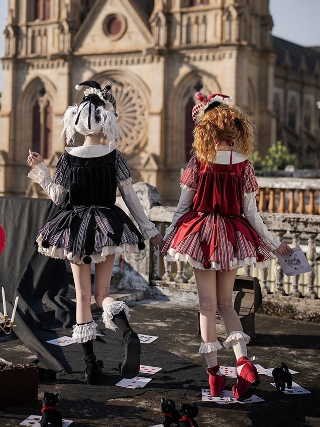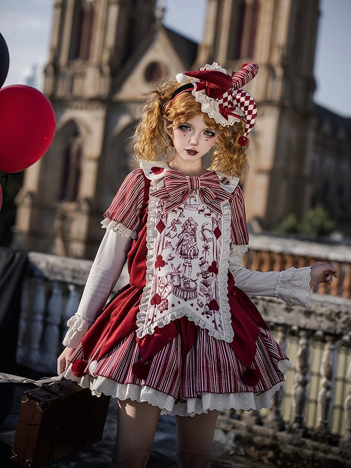 This OP (One-Piece) dress features a stylish box pleat design on the front neckline, adorned with exquisite poker-themed embroidery. The neckline is fastened with heart-shaped buttons for easy wear. The Juliet sleeve, with striped puff sleeves that echo the dress body, and double-layer lace trim at the cuffs.