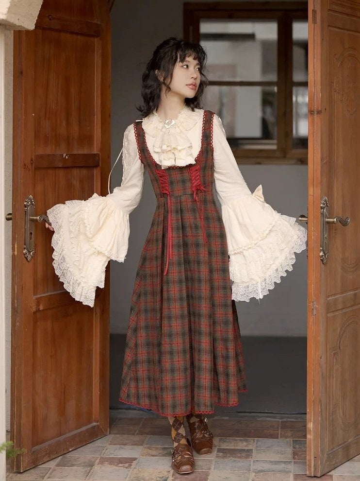 This timeless Lolita dress features a sophisticated reddish brown plaid pattern, exuding an air of elegance and classic charm. The lace-up detailing adds a touch of refinement, making it a perfect choice for those who appreciate the fusion of traditional style with modern flair.