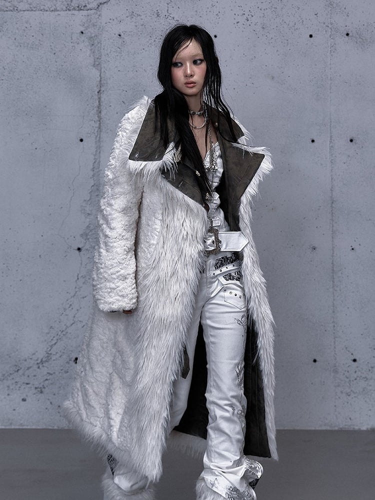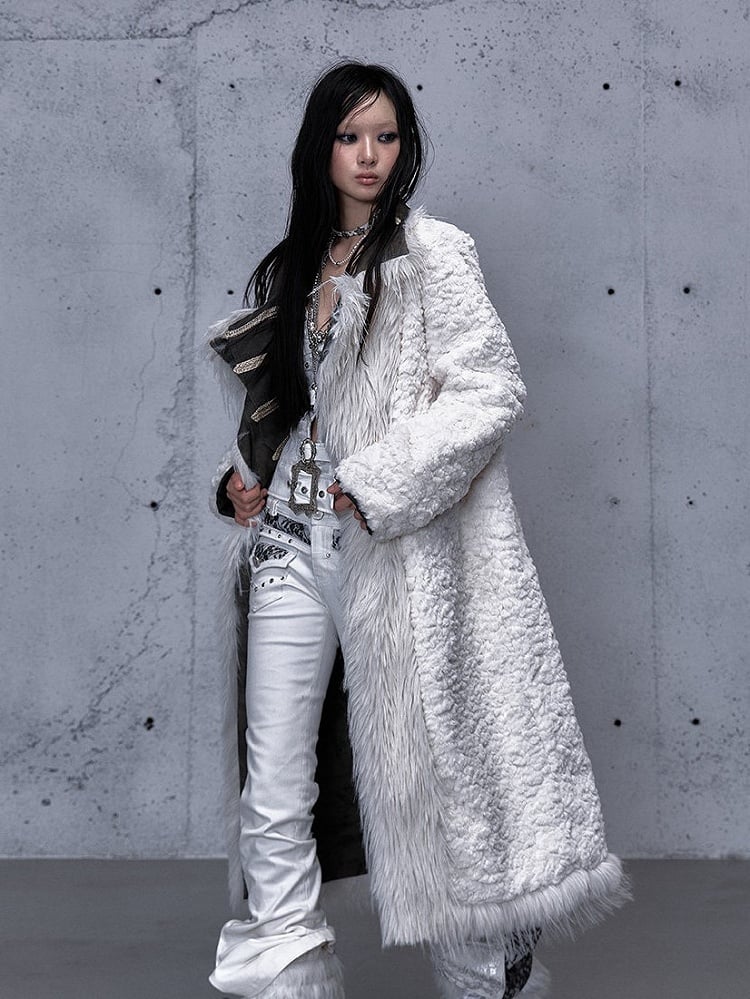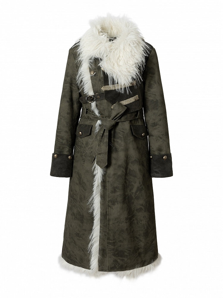 Unleash your edgy style with this versatile wasteland punk coat, featuring a unique reversible design. One side boasts eco-friendly faux fur for a plush, luxurious feel, while the other showcases smooth suede for a sleek, sophisticated look. The waist tie belt enhances your silhouette, and the buckle strap and buttoned cuffs add a touch of punk flair. Expertly crafted with patchwork detailing, this coat also includes functional pockets for added convenience.