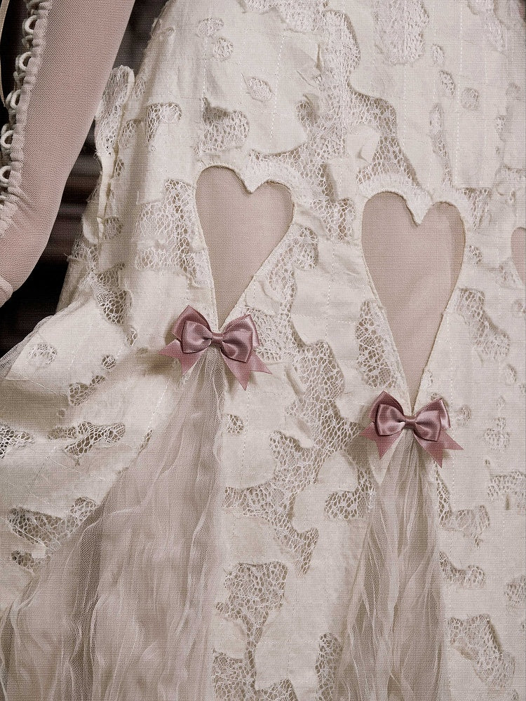 This dress features a charming square neckline, delicate lace trim extending along the neckline and shoulder straps for an exquisite touch. The front is embellished with a bow and embroidered patchwork, adding a whimsical flair. The skirt showcases an intricate blend of cutout fabric and sheer material, three heart-shaped cutouts, each adorned with pink bows, add a playful and romantic detail. Designed for ease and comfort, it includes a discreet side zipper for effortless wear and a lace-up back for a customizable fit.