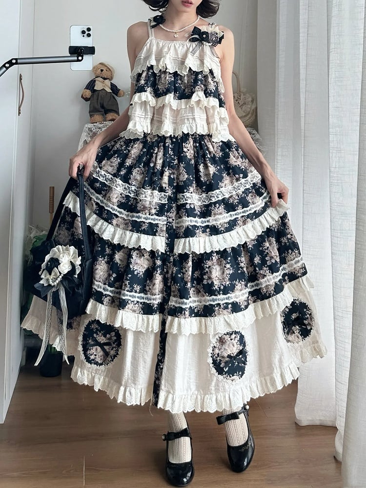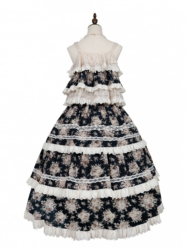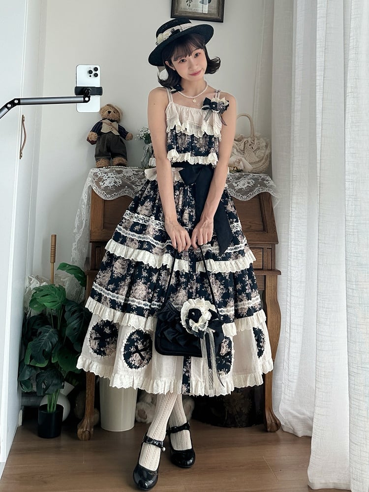 This exquisite skirt features a delicate rose floral print set against a classic black backdrop, the front button placket adds a vintage touch, while the scalloped eyelet trimming offers an intricate and feminine detail that sets this skirt apart. Designed with a comfortable elastic waistband, this skirt ensures a perfect fit for all-day wear.