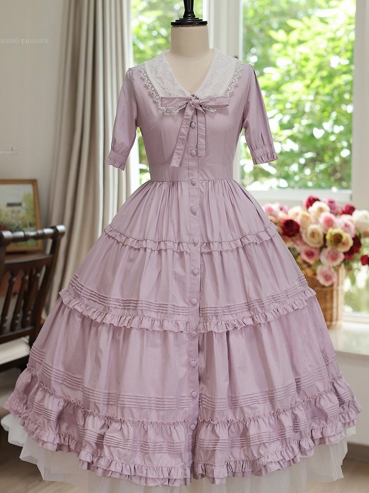 The dress boasts a beautifully crafted front button placket, adding a touch of vintage allure, while the rich purple hue brings a regal elegance to your wardrobe. The removable bowtie on the neckline offers versatility, allowing you to customize your look to suit any occasion.