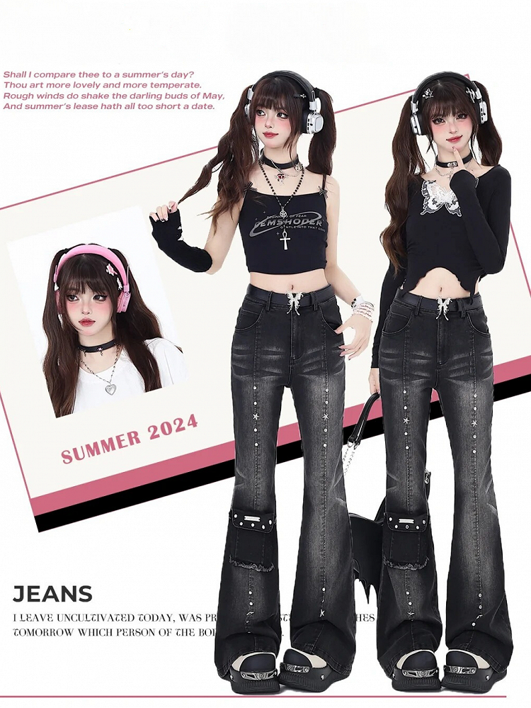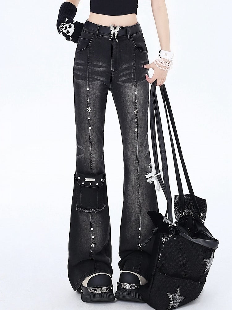 Elevate your edgy, retro-inspired look with our high-waisted flared jeans. These statement-making jeans feature a striking black and gray color scheme, accented with eye-catching silver studs for a touch of rebellious flair. The pocket design adds a practical yet stylish element, while the high-waisted silhouette offers a flattering, slimming effect.