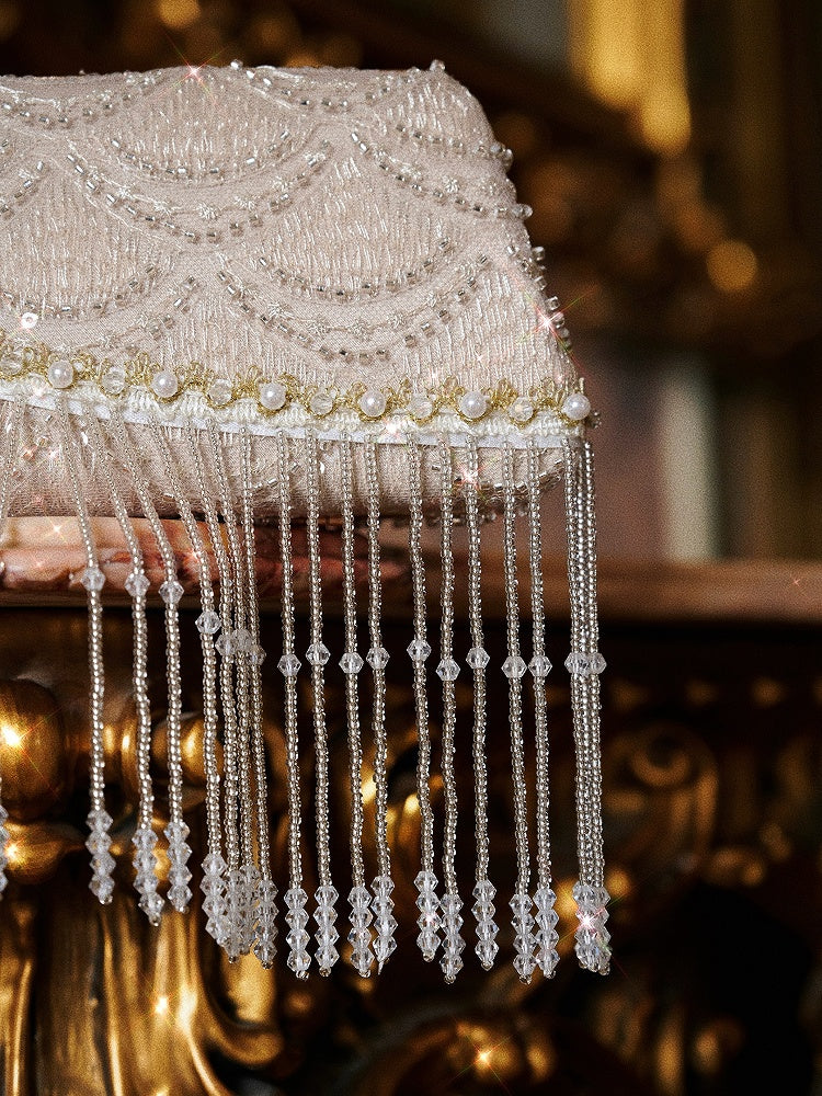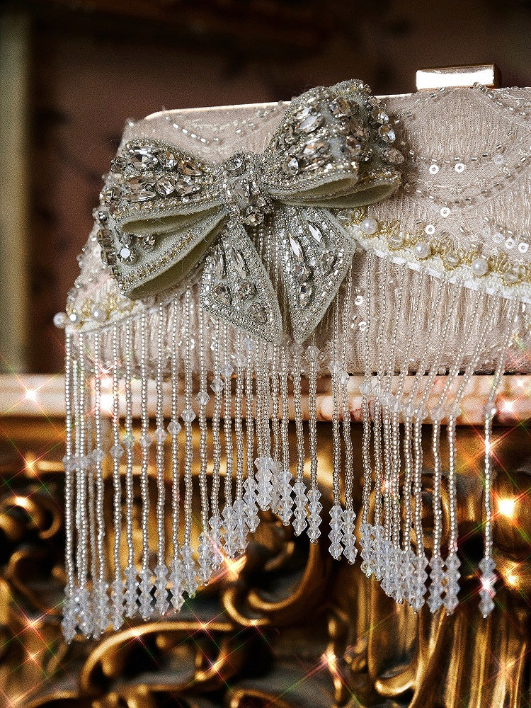 This light luxury convertible clutch is a true statement of elegance and versatility. It features a discreet, hand-strung champagne bead handle that can be tucked away when not in use, offering a seamless transition between handheld and clutch styles. The curved, cascading crystal glass tassels add a touch of dynamic sparkle and movement, adorning the body of the bag is a dazzling rhinestone-encrusted bow, which serves as a striking focal point.