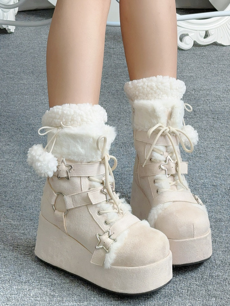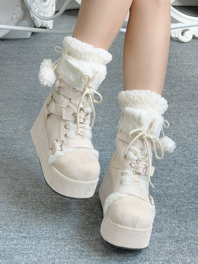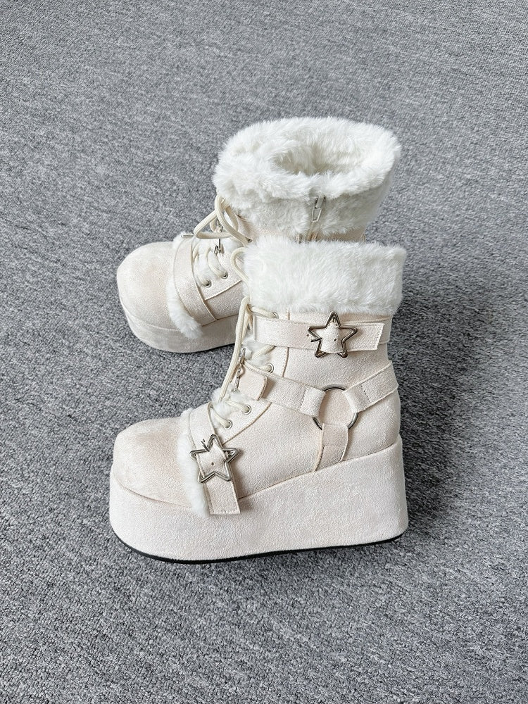 Step into winter with confidence and style with our chic Winter Platform Boots. Add a touch of celestial charm to your outfit with these unique star-shaped buckles. Keep your feet warm and cozy during the cold months with the ultra-soft plush lining. Customize your fit and add an element of classic style with the front lace-up ties. Enjoy easy on-and-off convenience with the sleek zip closures on the sides. Experience ultimate comfort and timeless elegance with the round-toe design.