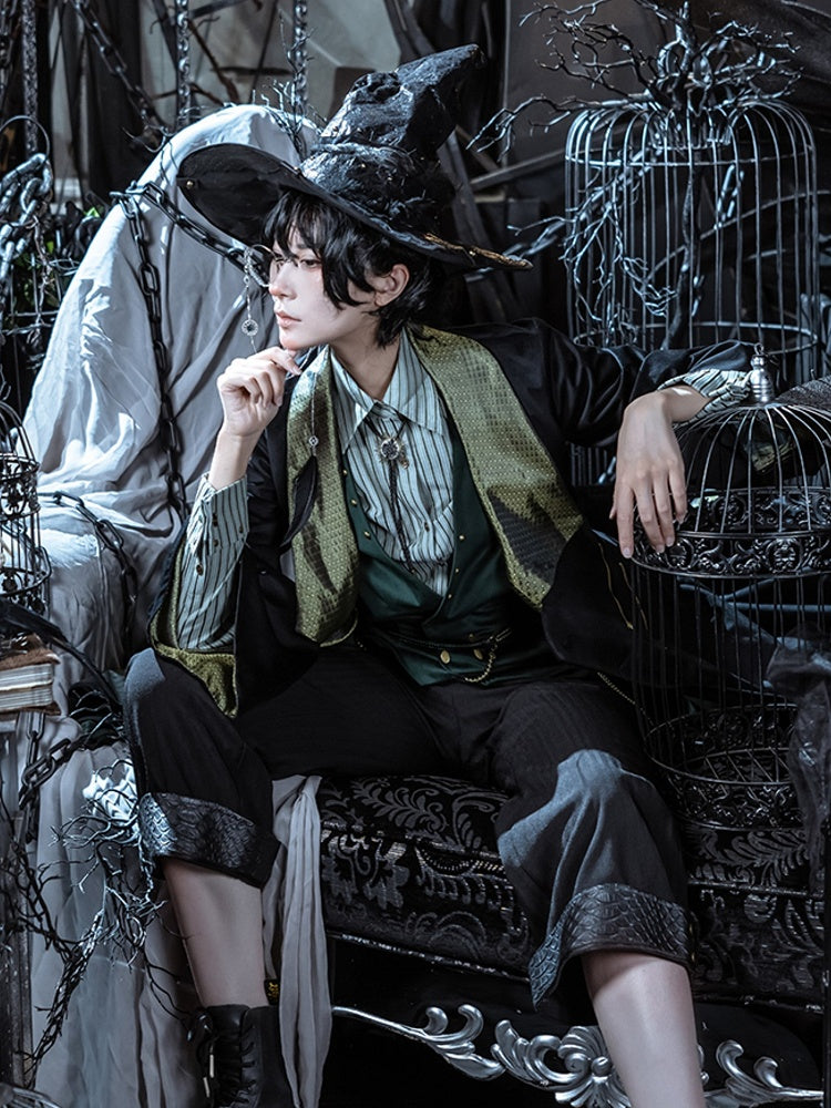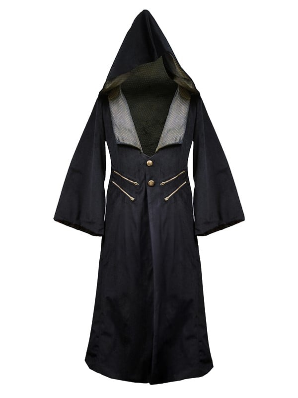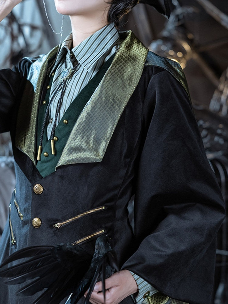 Crafted from plush black velveteen and interwoven with lustrous gold-green jacquard fabric, this coat is a testament to sophisticated design. The detachable hood offers versatile styling options, while the fashion-forward parallel double zippers add a contemporary edge.